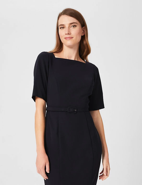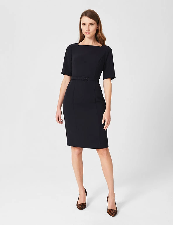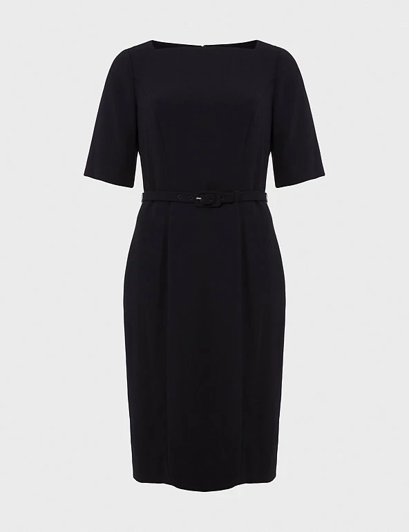 Refresh your workwear with this tailored shift dress from Hobbs. This versatile style is cut to a regular fit, with short sleeves and a modern square neck. A matching slim belt flatters the waist, and there’s a vent at the back of the knee-length skirt for easy everyday wear. This piece fastens with a concealed zip at the back. Made with recycled polyester lining.