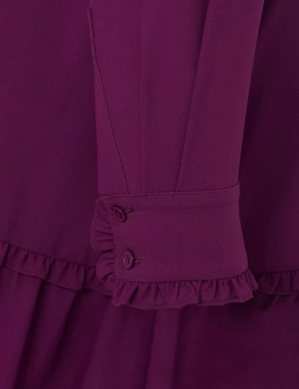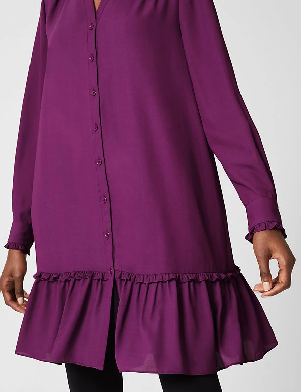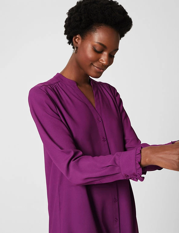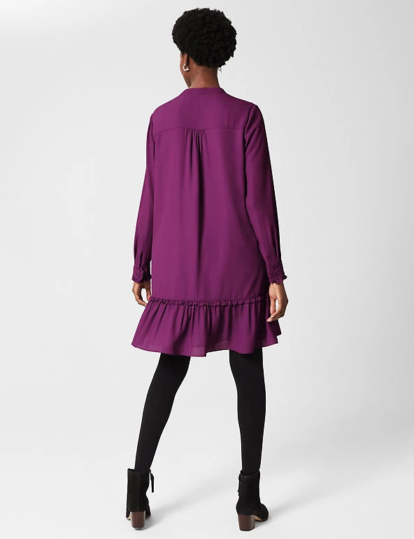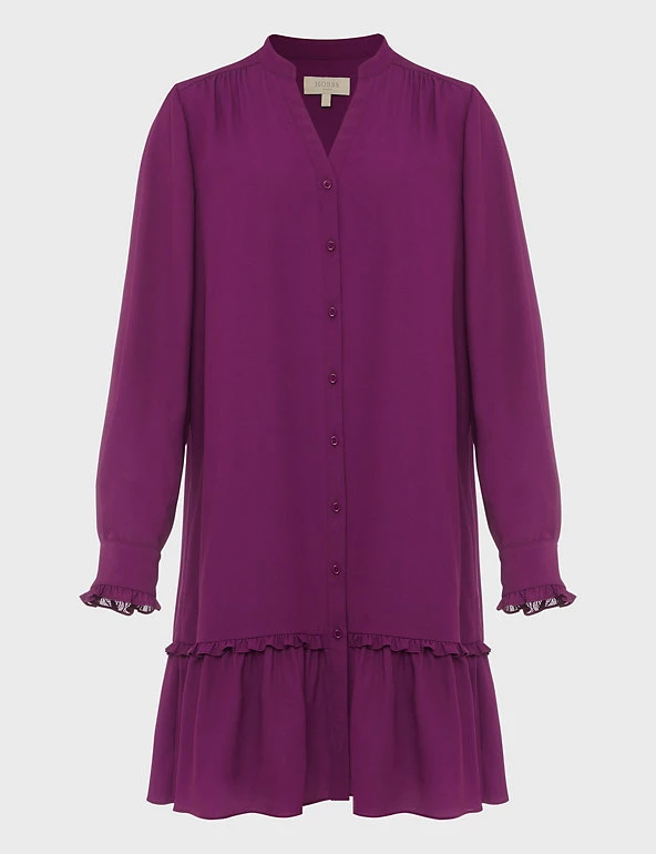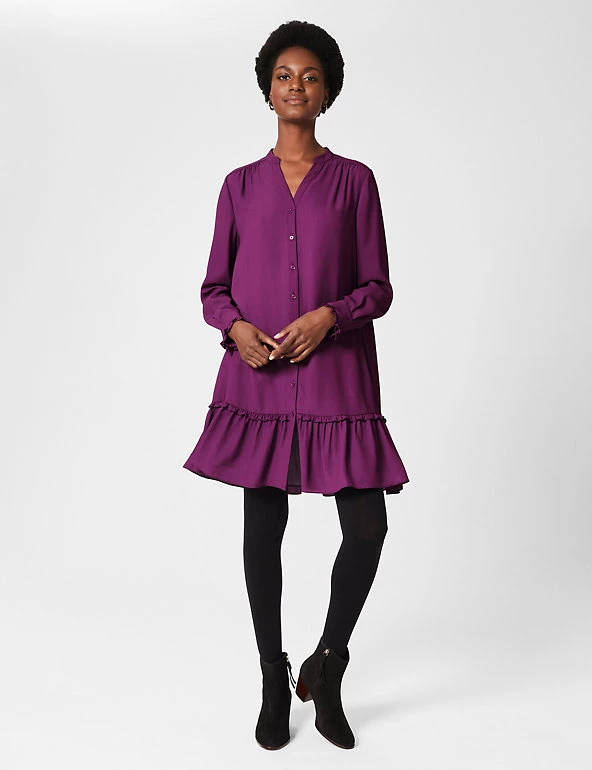 This elegant Hobbs swing dress will effortlessly take you from day to night. The regular-fit shape falls just above the knee with elegant fluting at the hem. Pretty frills and gathers on the shoulders add more feminine charm. The dress is framed with a collared v-neckline and fastens with buttons at the front.