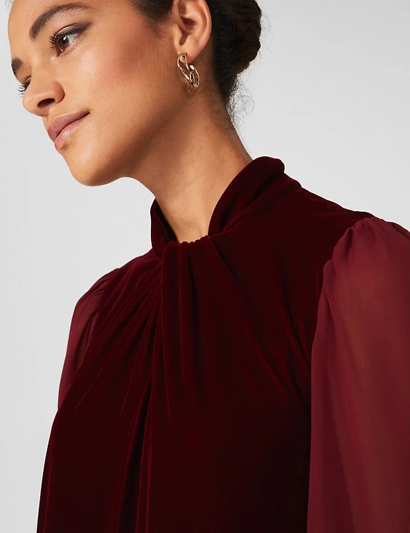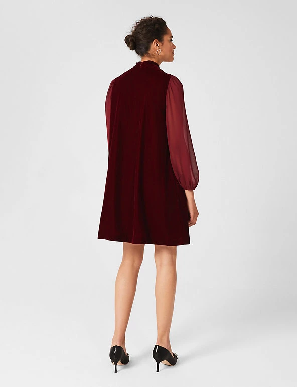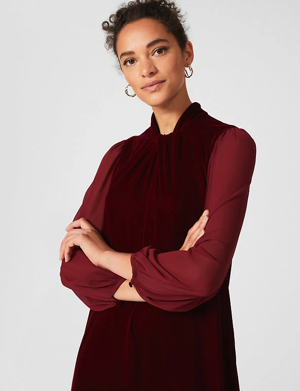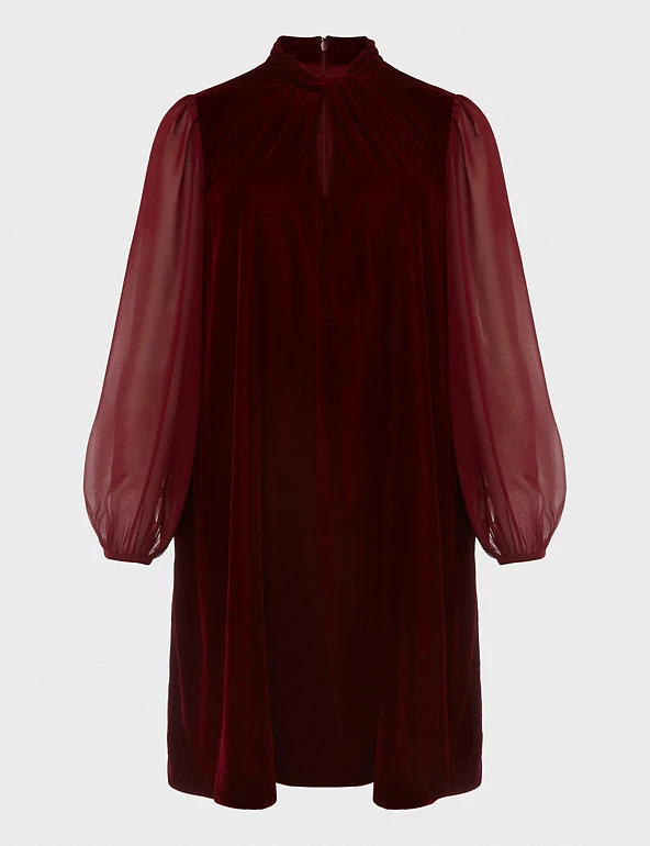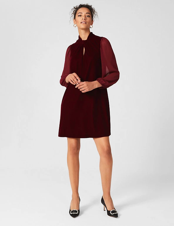 With its luxe velvet fabric, this Hobbs dress is perfect for special occasions. Its relaxed fit and shift shape create an unstructured silhouette, and the mini-length hemline adds a flirty feel. The sheer three-quarter sleeves are gathered at the shoulders and cuffs to give this season’s essential puffed outline.