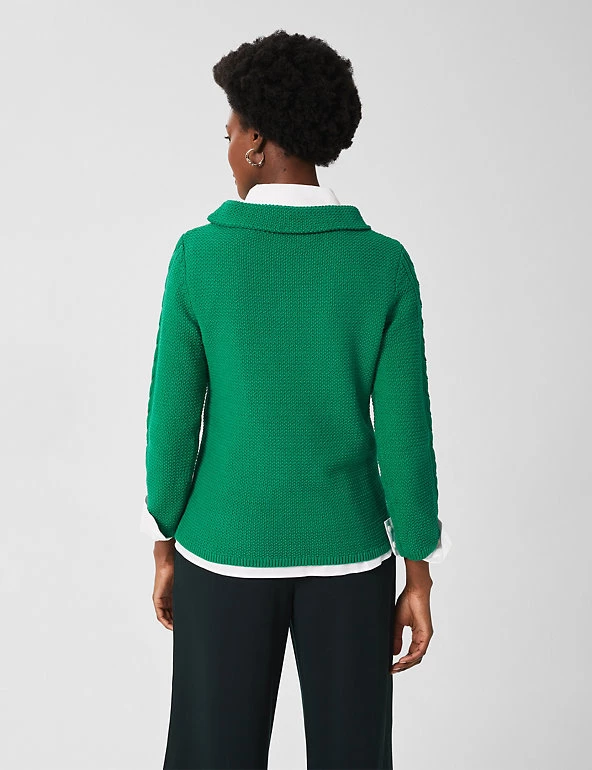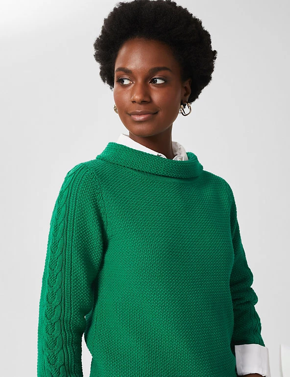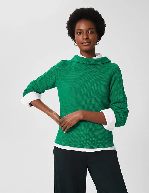 Create elegant off-duty style with this cosy pure cotton jumper from Hobbs. It’s knitted to an easy regular fit and has flattering three-quarter length sleeves. A rolled collared neckline makes it perfect for layering, while the cable knit detailing lends a premium feel. This brand is proud to invest in making cotton production more sustainable.