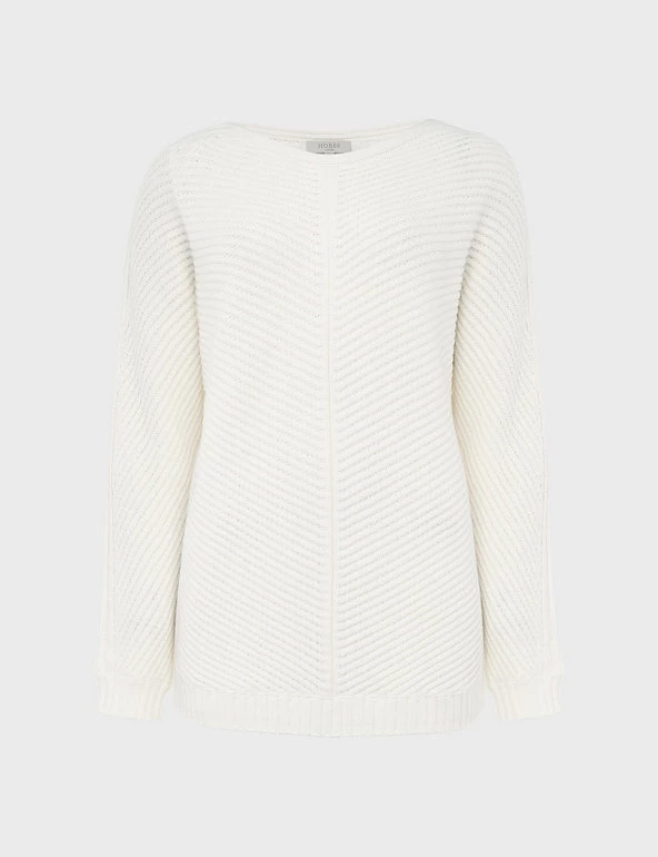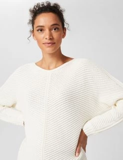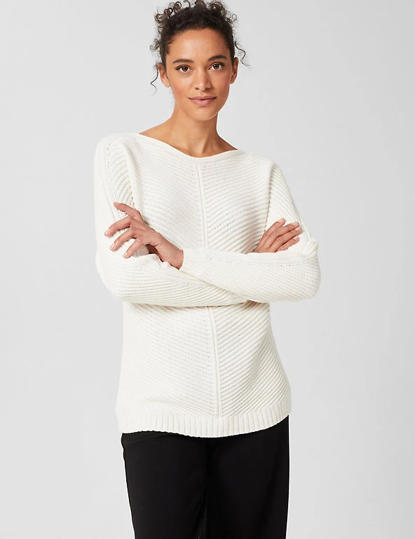 Embrace effortless knitwear with this pure cotton jumper from Hobbs. It’s cut in an easy relaxed fit, with diagonal ribbed detailing that draws the eye down. The long batwing sleeves are designed to flatter, and a slash neckline gives an elegant finish. This brand is proud to invest in making cotton production more sustainable.
