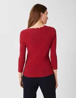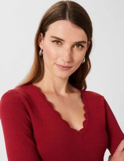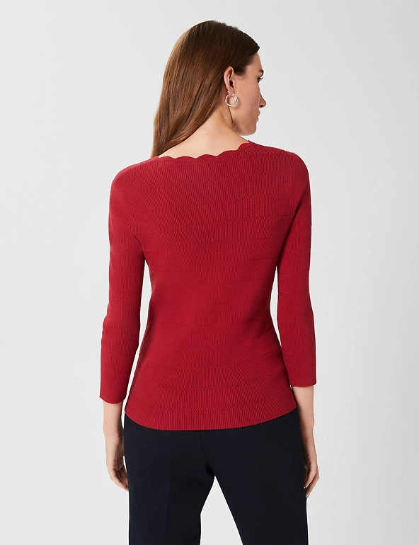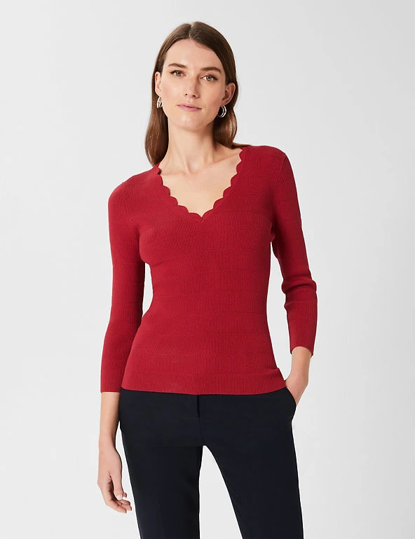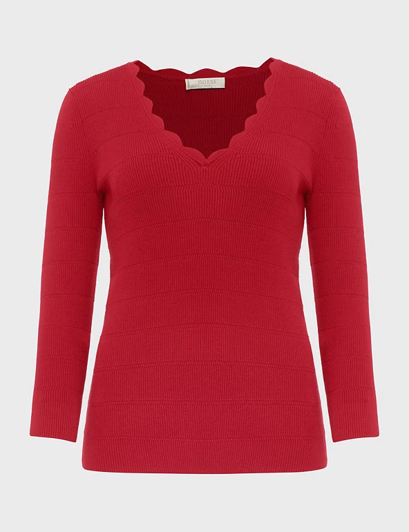Scallop edging around the v-shaped neck gives a playful look to this jumper from Hobbs. It is knitted to an easy regular fit and is finished with flattering three-quarter length sleeves. Ribbed detailing adds a premium feel. Made with sustainably sourced viscose.