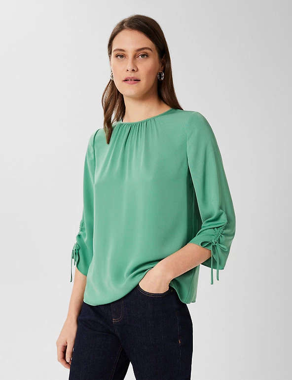 This blouse from Hobbs has ruched ties at the three-quarter sleeves that add elegant detail. It’s styled in a flowing relaxed fit, with gathers at the crew neckline to create extra drapiness. It fastens with a keyhole button at the back of the neck. Made with recycled polyester.