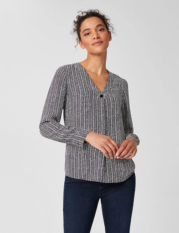 This Hobbs blouse is a work-to-weekend hero. Crafted in an effortless regular fit, this versatile top has flattering long sleeves and an all-over geometric print that’ll elevate any outfit. A v-neck with bold button detailing and a pleat down the front creates subtle drape and texture. Made with recycled polyester.