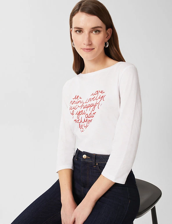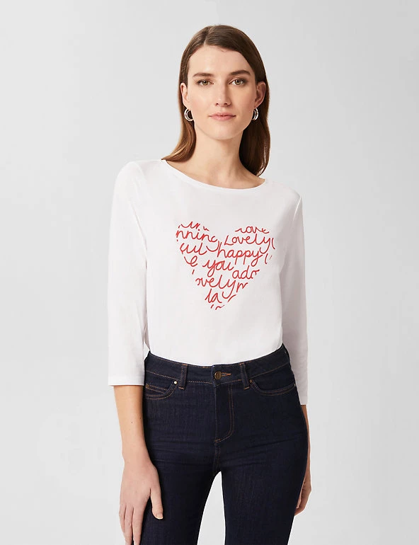 Add a playful touch to your outfit with this pure cotton t-shirt from Hobbs. It has a regular fit, with chic three-quarter length sleeves. The chest features a heart filled with positive words in a handwritten typeface. This brand is proud to invest in making cotton production more sustainable.