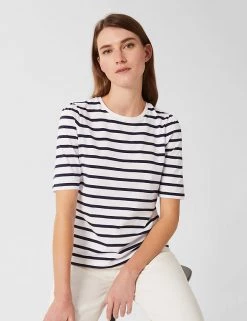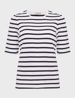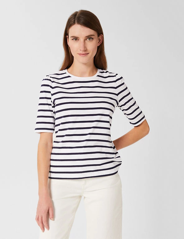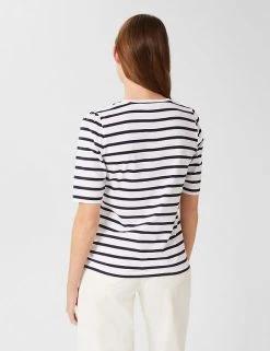 Channel a nautical vibe with this premium pure-cotton t-shirt by Hobbs. This regular-fit piece is adorned with a bold stripe print. It sports a classic crew neck and breezy short sleeves that are perfect for warmer days. This brand is proud to invest in making cotton production more sustainable.