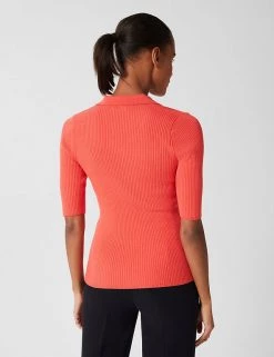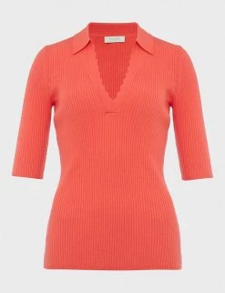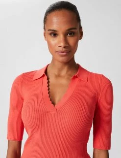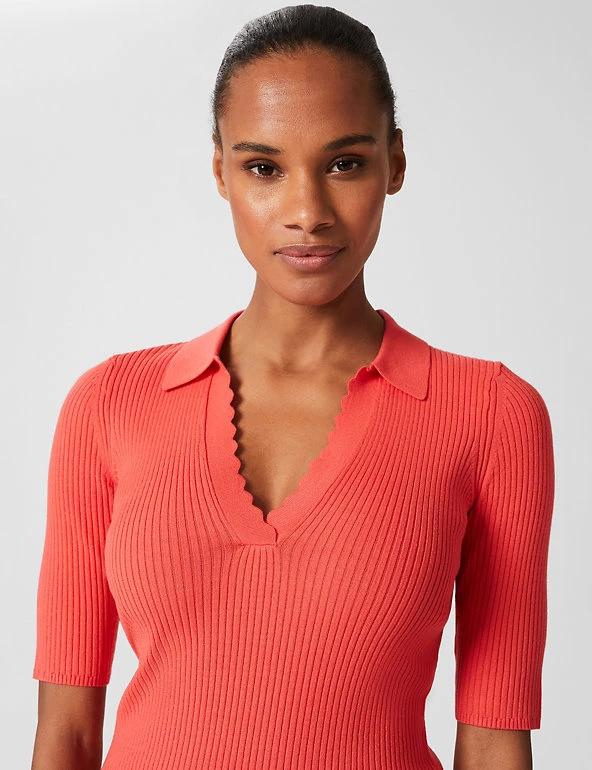 Bring a preppy feel to your knitwear collection with this stylish Hobbs top. Its slim fit and short sleeves ensure a neat silhouette, and the collar gives an extra touch of smartness. All-over ribbing adds textural interest and a scalloped edge at the v-neckline creates a feminine air. Made with sustainably sourced viscose.