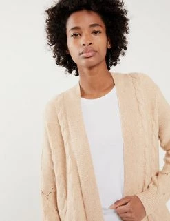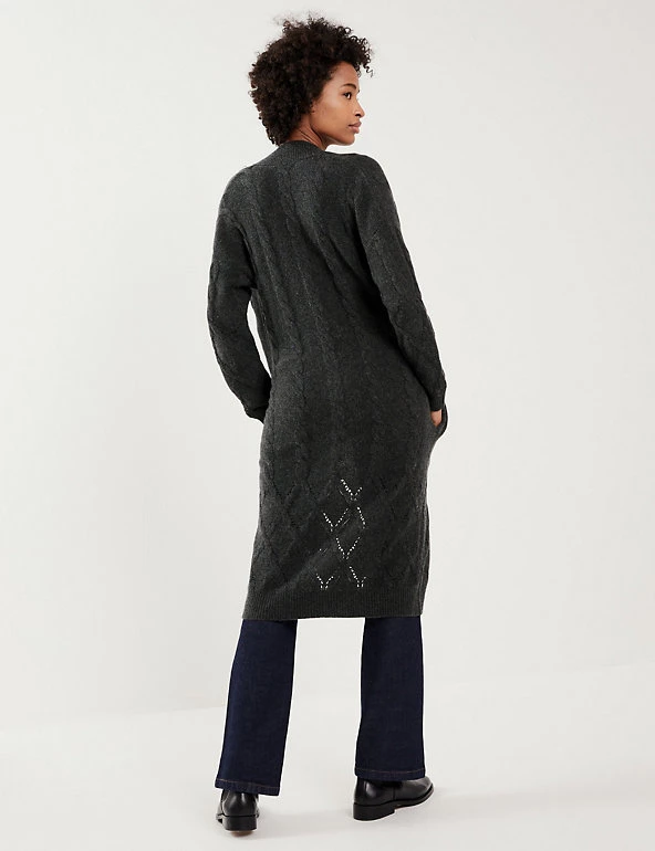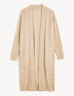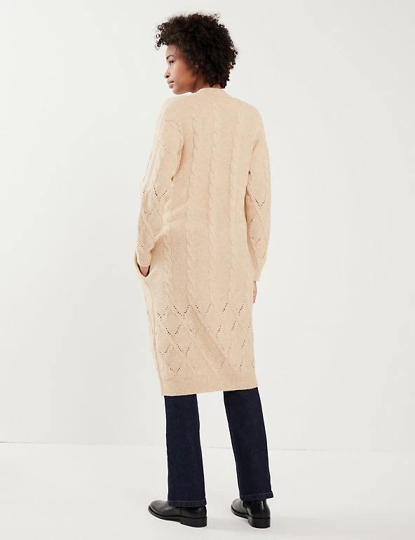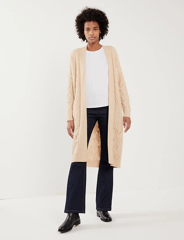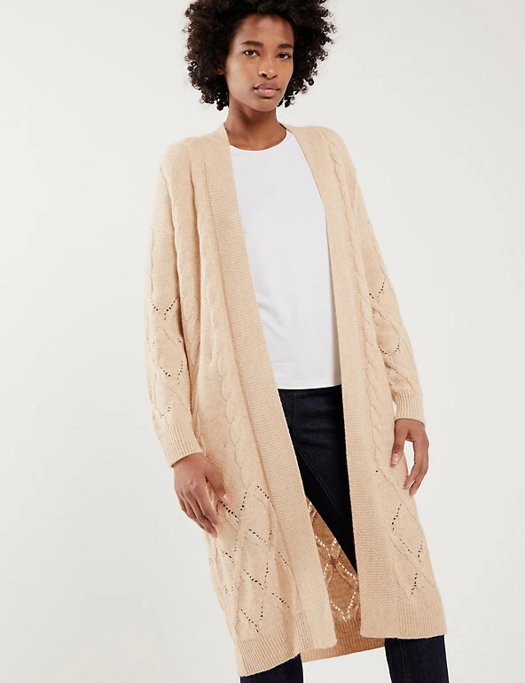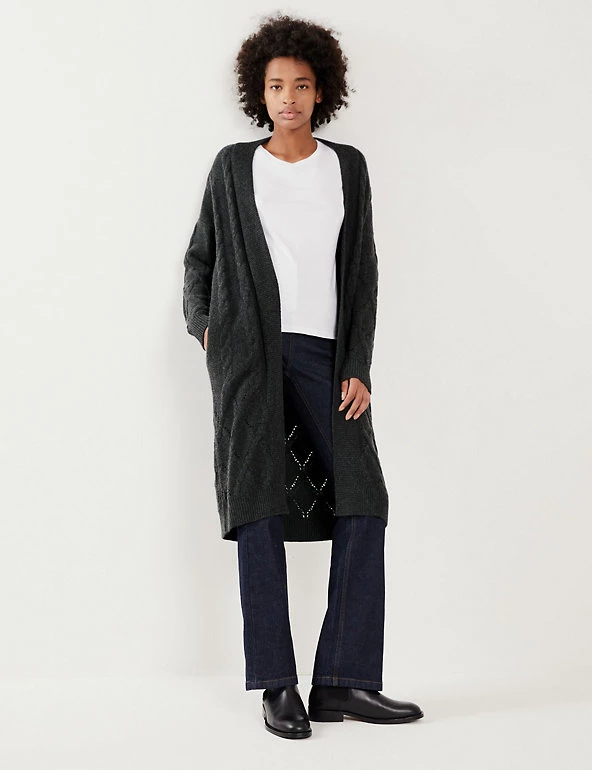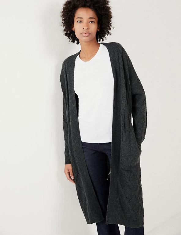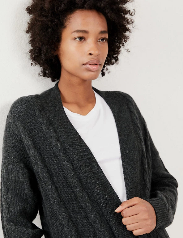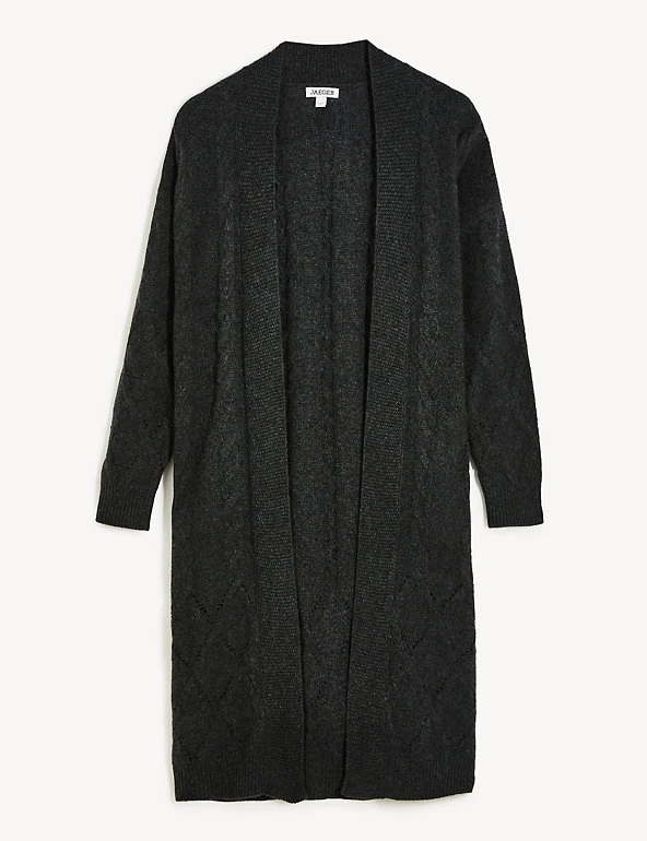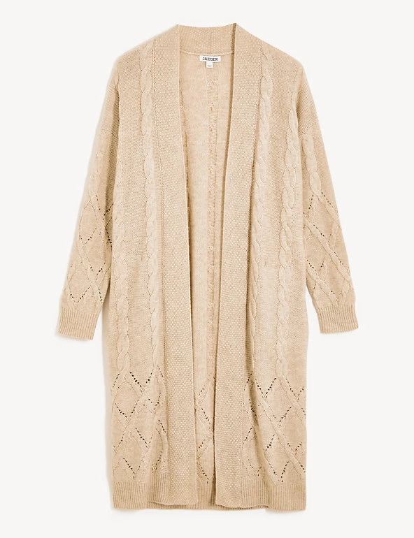 This wool-rich cardigan from Jaeger comes with a touch of cashmere that will keep you warm and cosy. It’s knitted to a regular fit and longline length for ample coverage. The beautifully soft cable knit design changes pattern towards the hem for a unique finish.
