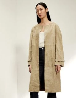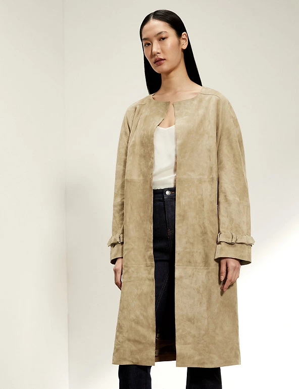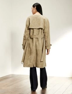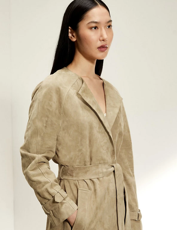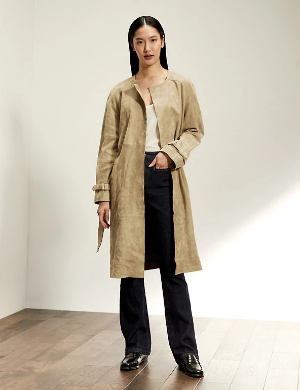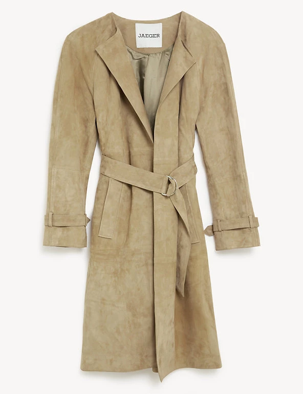 This beautiful suede trench coat from Jaeger will add the perfect finishing touch to any look. It’s cut to a regular shape, with a D-ring tie at the waist to create a flattering silhouette. All the classic touches are here, from tie detailing on the cuffs to a storm flap at the back. Two side pockets provide plenty of space for your essentials. Wear with jeans and a jumper for an instant outfit. This piece is lined for comfort.