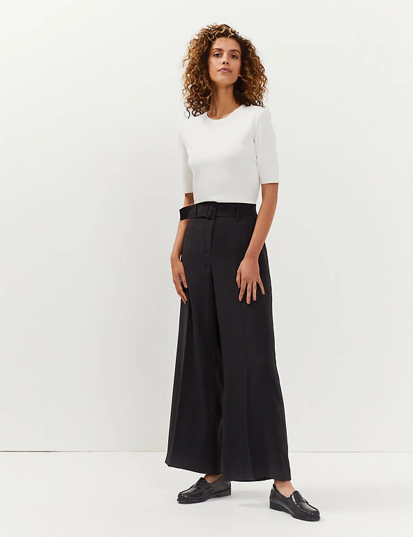 A versatile wardrobe addition, these crepe Jaeger trousers will go with more or less anything. Cut in a fluid, wide-leg silhouette, they sit high on the waist and fasten with a belt to accentuate your figure. Side pockets add practicality and the zip fly fastening gives the pair a smart finish.