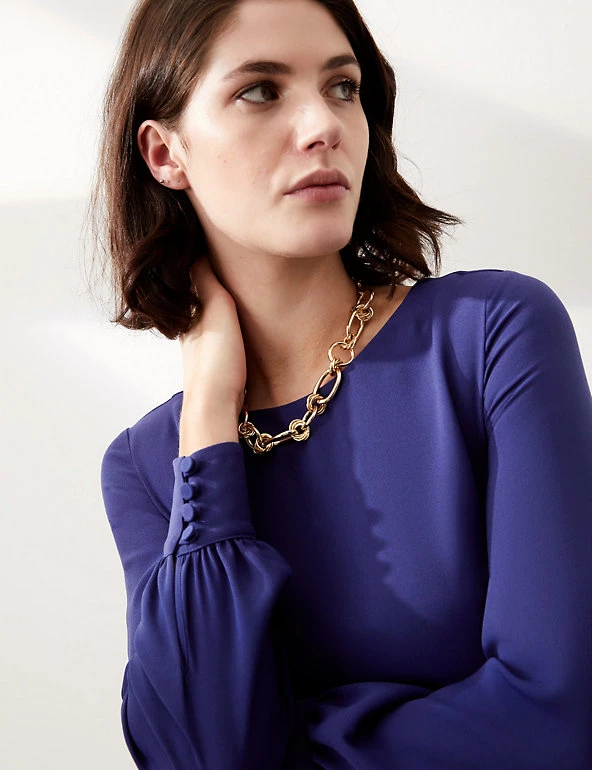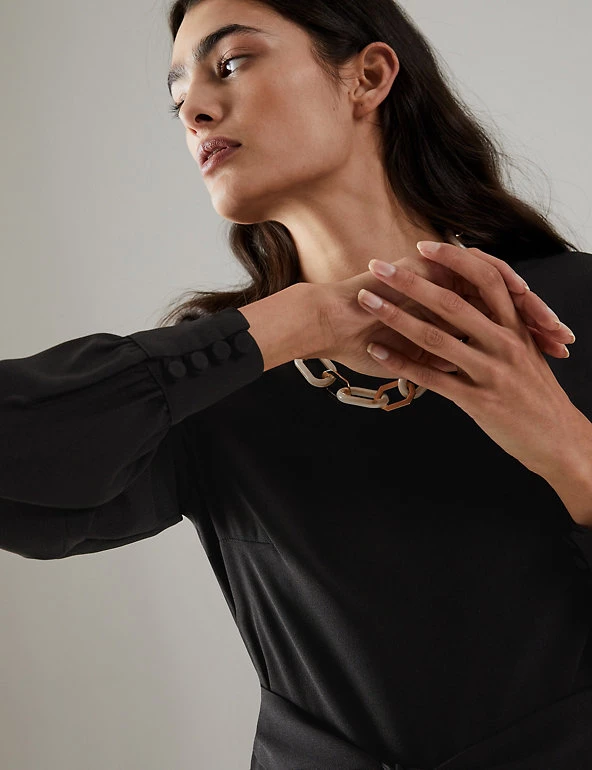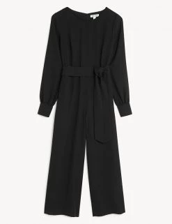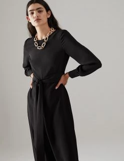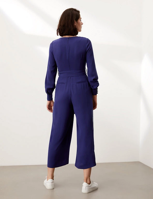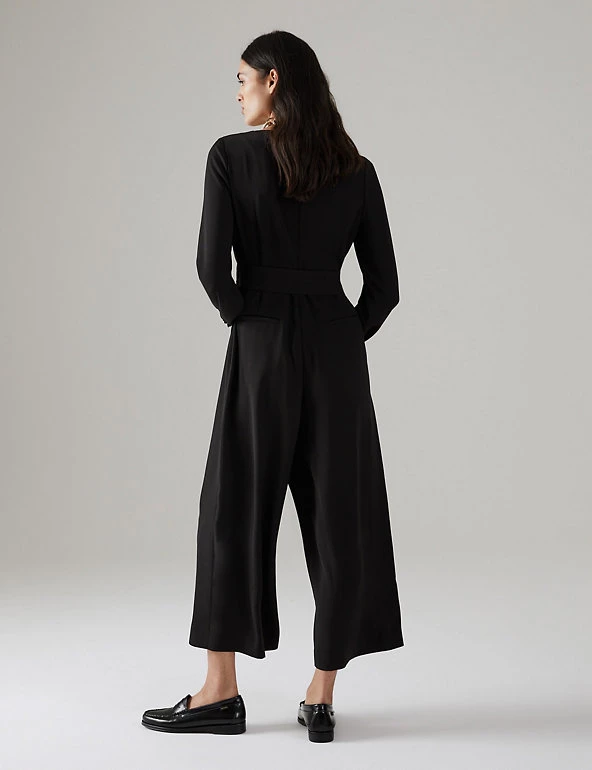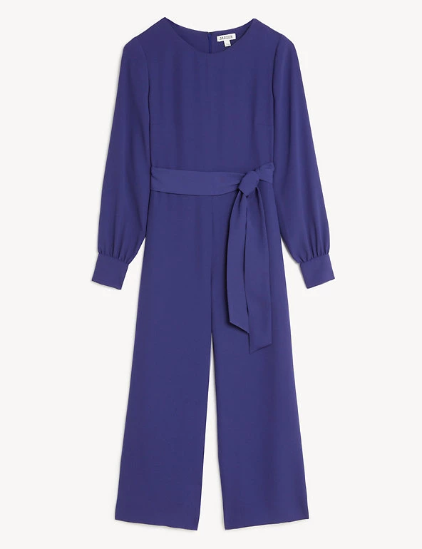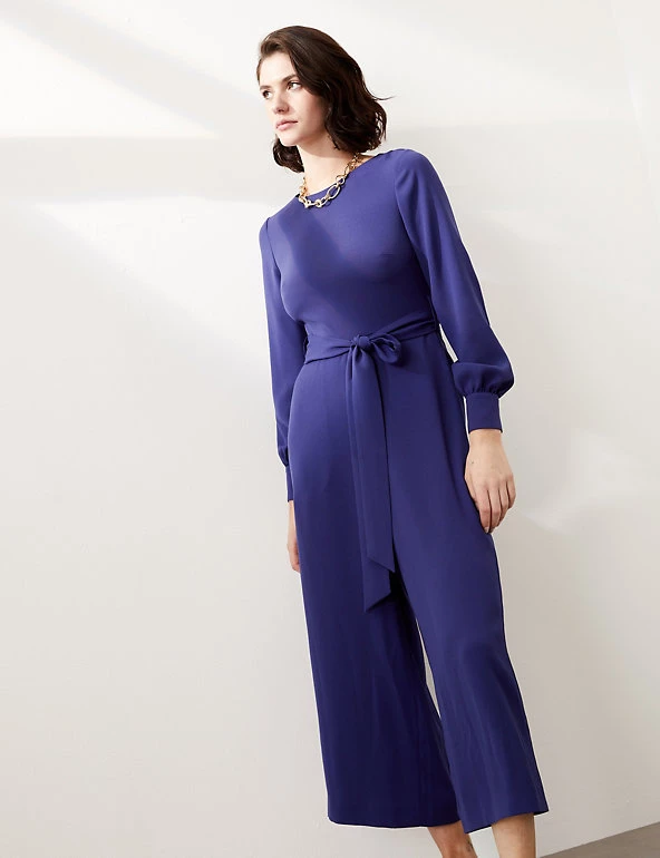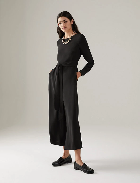 Embrace day-to-night dressing with this modern jumpsuit from Jaeger. It’s cut from lightweight crepe to a regular fit for effortless wear, with a wide, cropped leg and smart round neck. The long sleeves provide extra coverage, while a matching tie cinches in the waist for a flattering silhouette. This versatile style fastens with a zip at the back. If in between sizes, we recommend choosing the next size up.