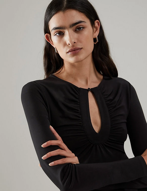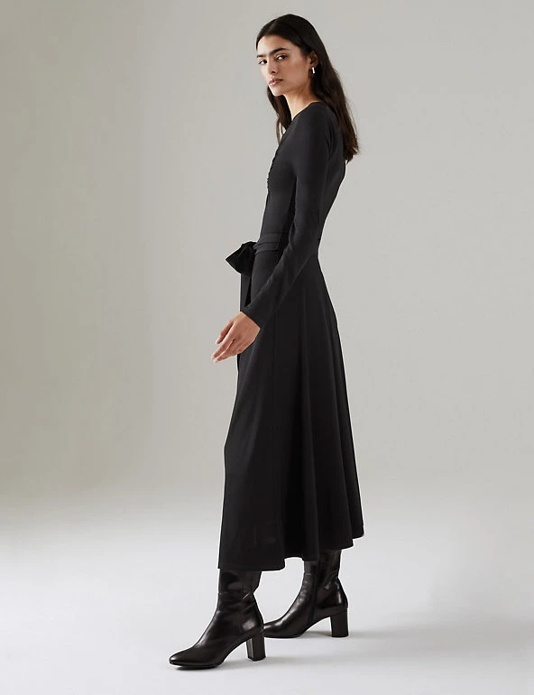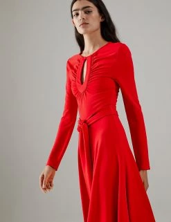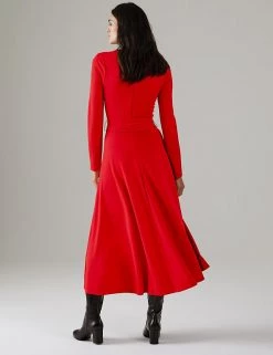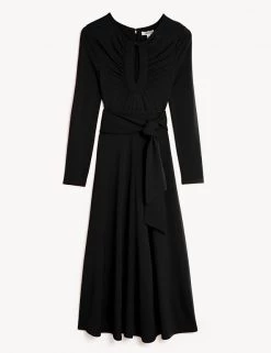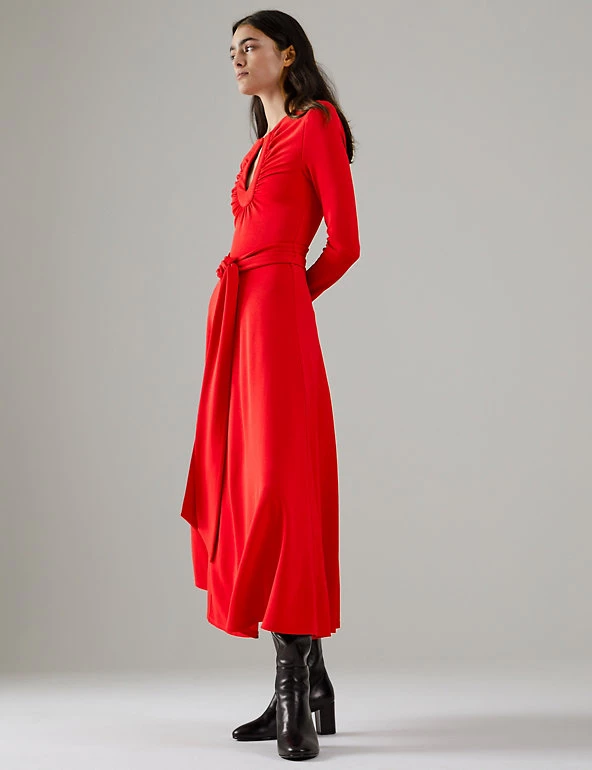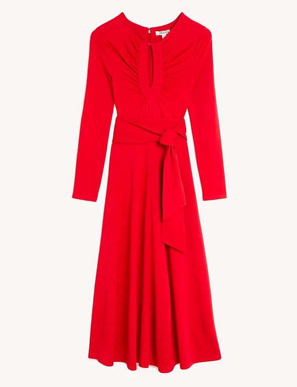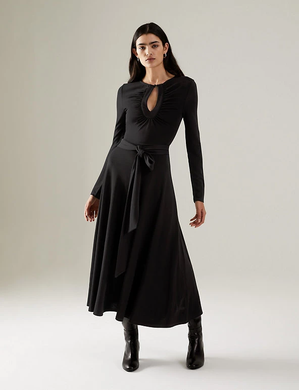 Perfect for a special occasion, this swing dress from Jaeger is bound to make an impression. It’s cut to a regular fit from a beautifully soft material, with a crew neckline and long sleeves. It boats a super-flattering shape and features ruched cut-out detail features on the chest as well as a fabric belt to cinch in the waist. The dress is designed to an on-trend maxi length with added stretch for extra comfort. It fastens with a back zip.