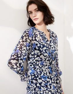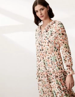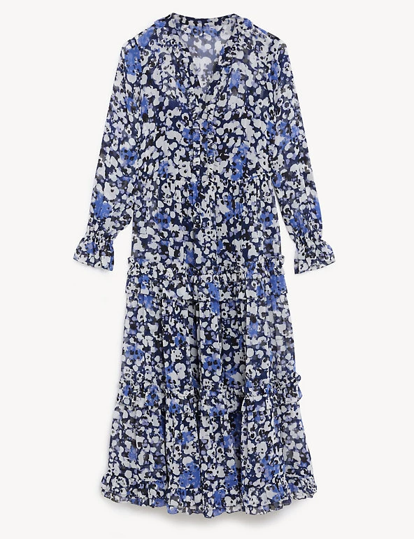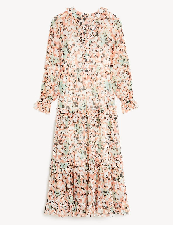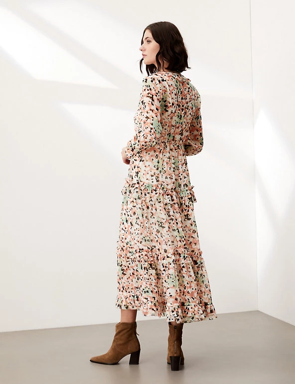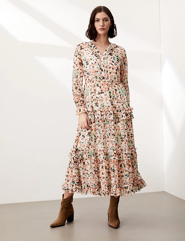 This Jaeger dress exudes floral charm and makes a versatile choice for any occasion. Cut in a regular fit, this midi piece has a flattering v-neck and elegant long sleeves. Tiered ruffle detailing adds a twirl-worthy finish, while a slip lining provides an opaque look. A contemporary button closure completes the design. Style the dress up with heels for a night out or channel pared-back chic by matching it with trainers. Made with recycled polyester.