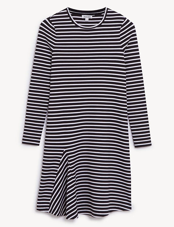 This striped jersey dress from Jaeger has a Godet insert in the hemline, creating fluttery movement and an extra-stylish silhouette. Its unstructured swing shape is cut in a comfortable regular fit, with long sleeves for plenty of coverage. Supersoft fabric feels gorgeously gentle on your skin. A feminine round neck and a knee-length hem ensure a go-anywhere look, and added stretch creates a smooth, easy wear.
