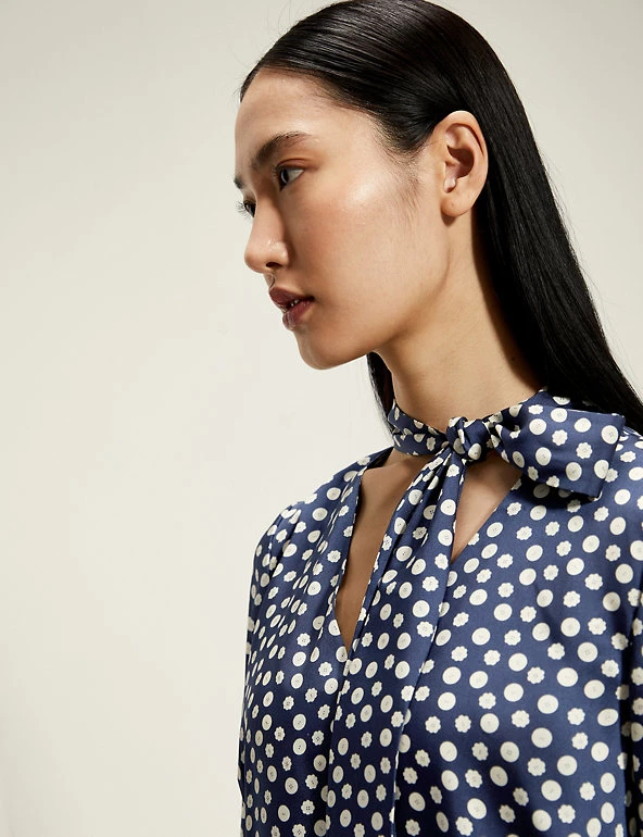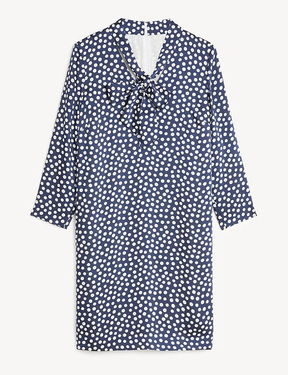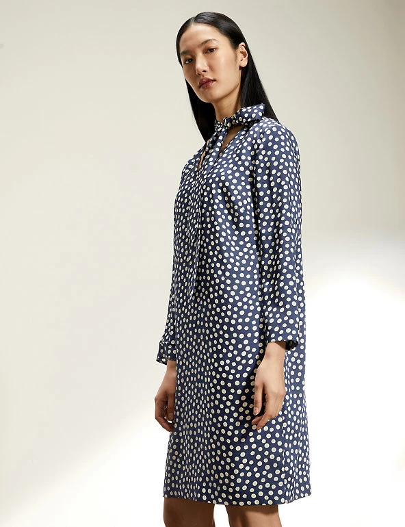 With a chic button print exclusively designed for Jaeger, this distinctive shift dress is one for the occasion wardrobe. Cut to a regular fit, the dress is fully lined and has a flattering mini length with three-quarter sleeves. It features a contemporary v-neck pussybow design to give it a showstopping finish. Pair it with trainers during the day and switch to heels in the evening for a glamorous look.