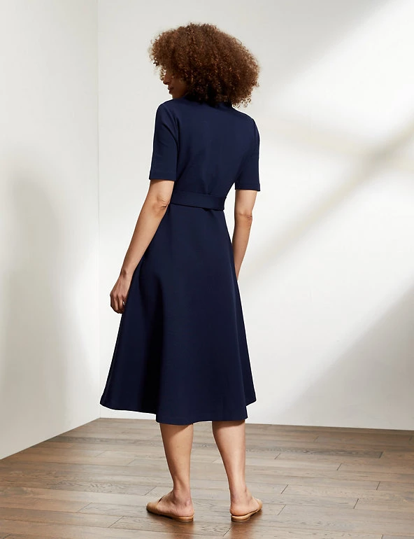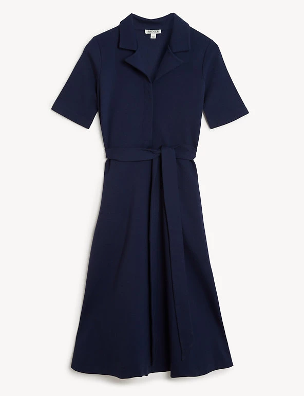 Sleek and stylish, this waisted dress by Jaeger is an instant outfit. Crafted in a regular fit, this short-sleeve piece has added stretch for comfort plus a flattering waist tie. It’s designed with a fitted bodice and a gently flared skirt, creating a feminine silhouette. A smart collar and covered button placket provide a neat finish. This day-to-night style can be dressed down with trainers or taken up a notch with heels.