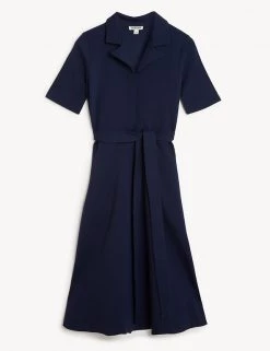 Product Style: Waisted dress, Product Length: Midi, Fit: Regular fit, Fastening: Tie fastening, Unlined, Neck Shape: Collared neck, Sleeve length: Short sleeve, Added Stretch