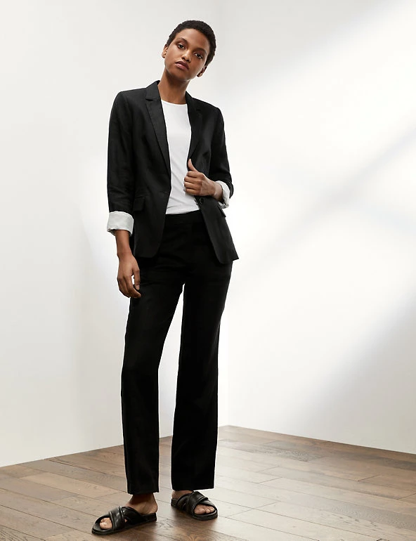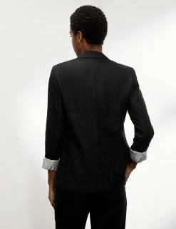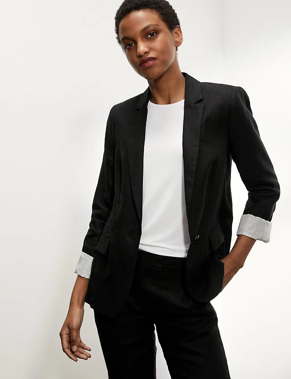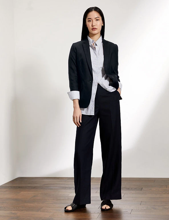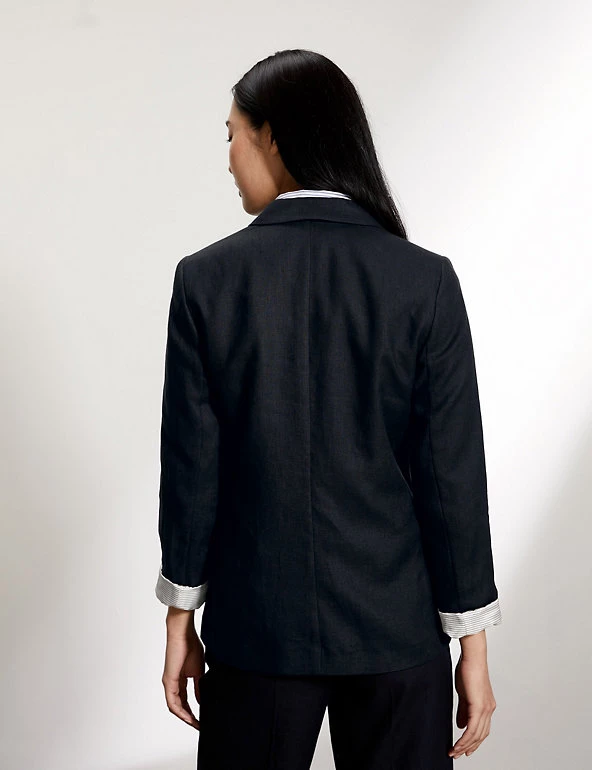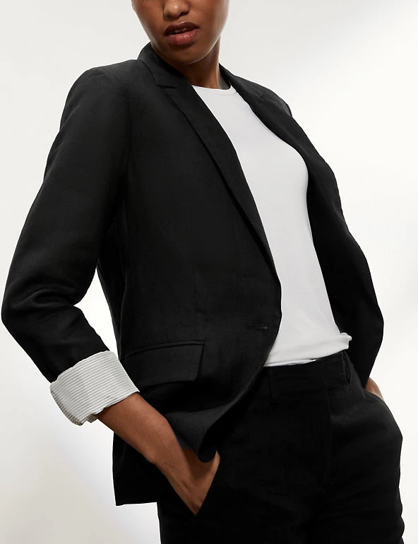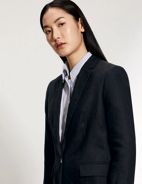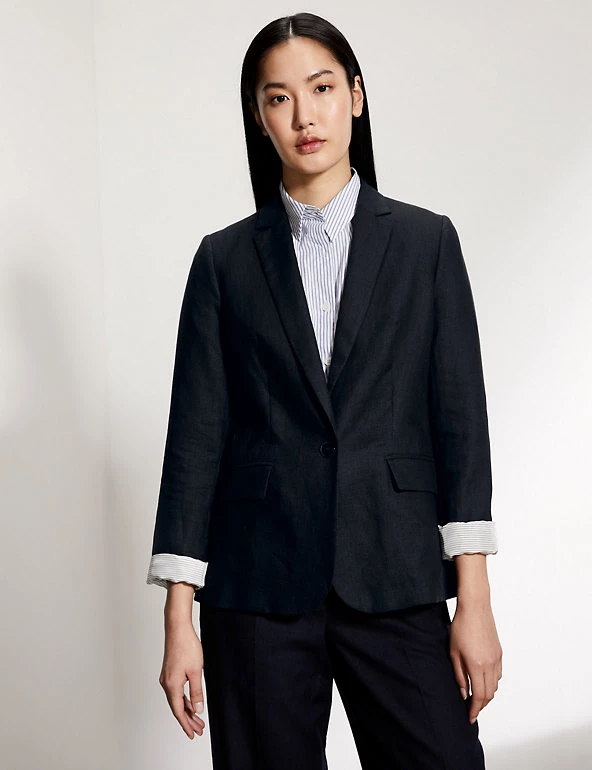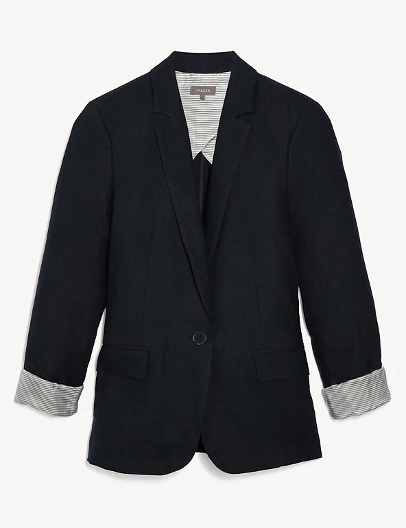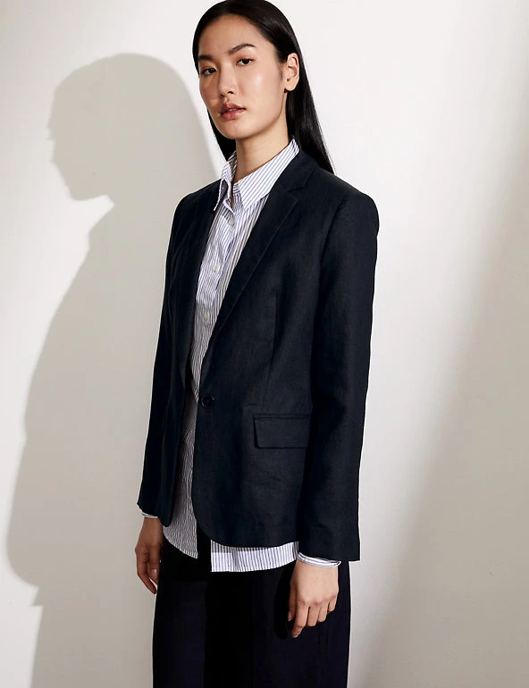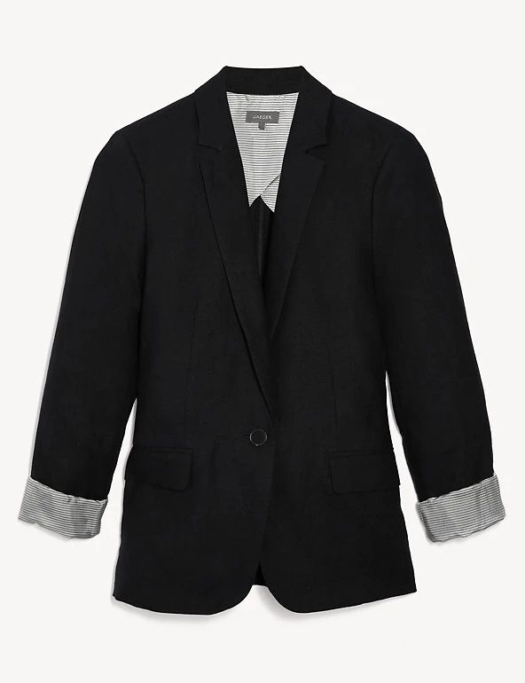 This timeless Jaeger blazer is crafted from pure European linen for a summery twist on formal attire. The single-breasted silhouette is cut in a relaxed fit with room to move, and pulled together with notched lapels and flap pockets for a smart finish. Wear the cuffs rolled-back to expose the striped lining and create a laid-back look.