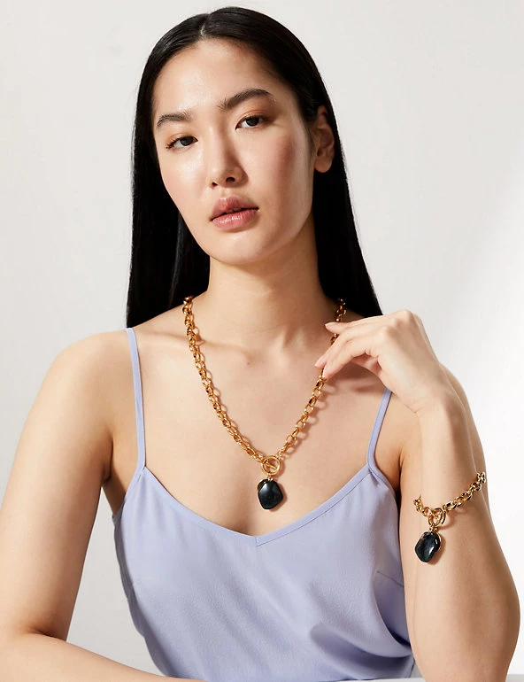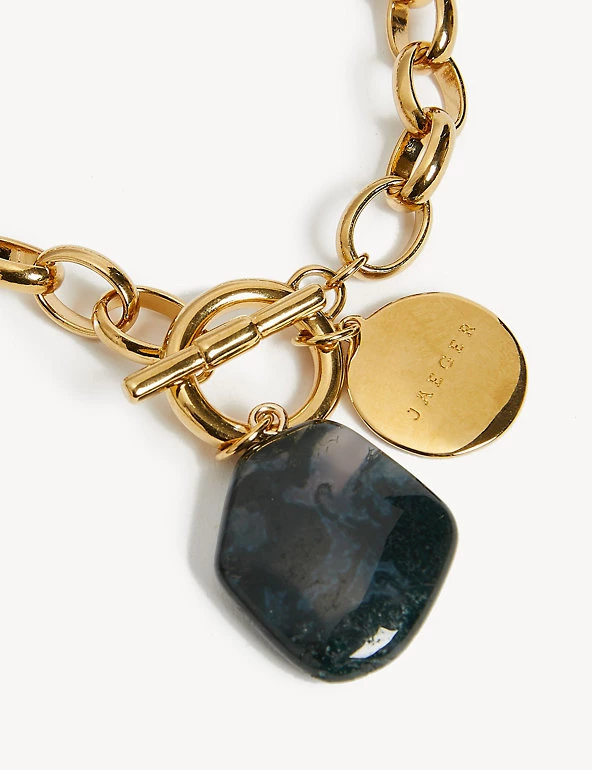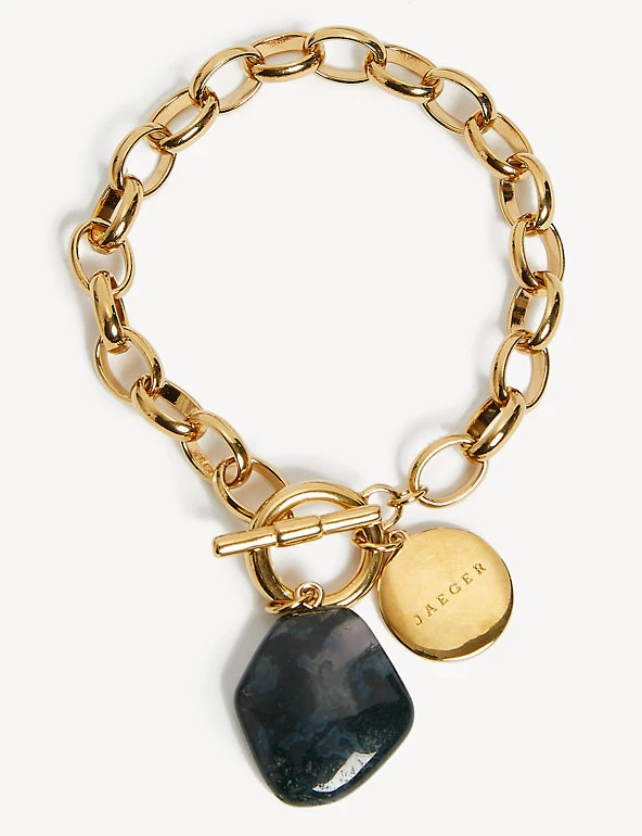 Dress up any outfit with this golden bracelet from Jaeger, made in the UK. The chain is comprised of chunky links, with a hammered disc and stone pendant at the drop. It fastens with a T-bar and can be paired with the matching Jaeger necklace for an elevated day-to-night outfit. This bracelet features hand cut Green Malachite. As the stones are semi-precious, no two stones are identical. There can also be a colour variance.