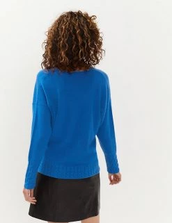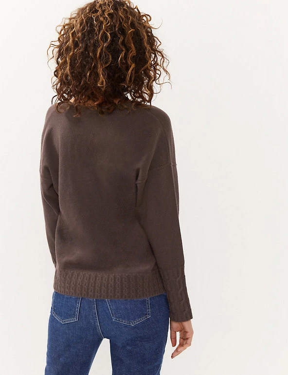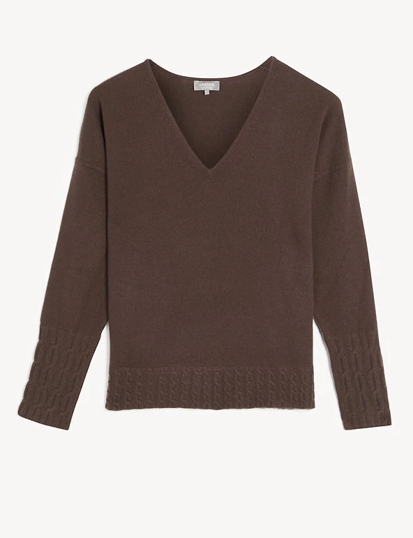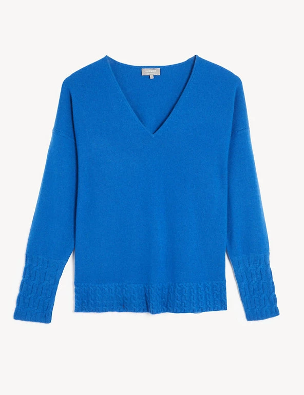 This pure cashmere jumper from Jaeger blends luxurious softness with an easy, slouchy shape. It’s cut in a regular fit, with a flattering v-neck and long sleeves. Cable knit detailing on the long cuffs and hem adds texture and interest to this effortlessly stylish piece.