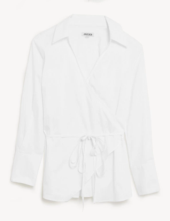 Add a modern classic to your wardrobe with this cotton-rich shirt from Jaeger. This versatile piece is crafted in a regular shape with added stretch for your perfect fit. The flattering wrap shape adds a contemporary touch, and a slim waist tie highlights the silhouette. A day-to-night style that looks great with casual jeans or tailored trousers.