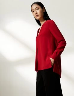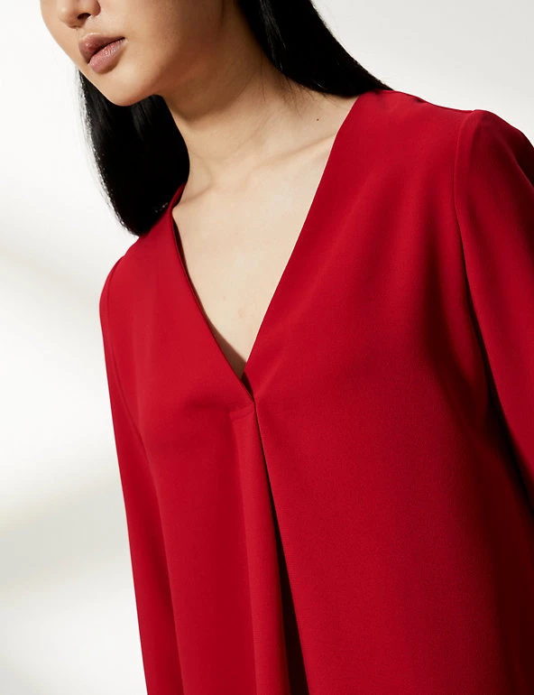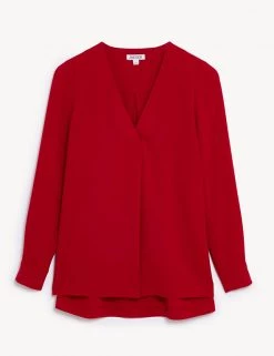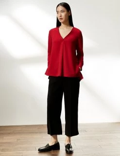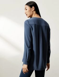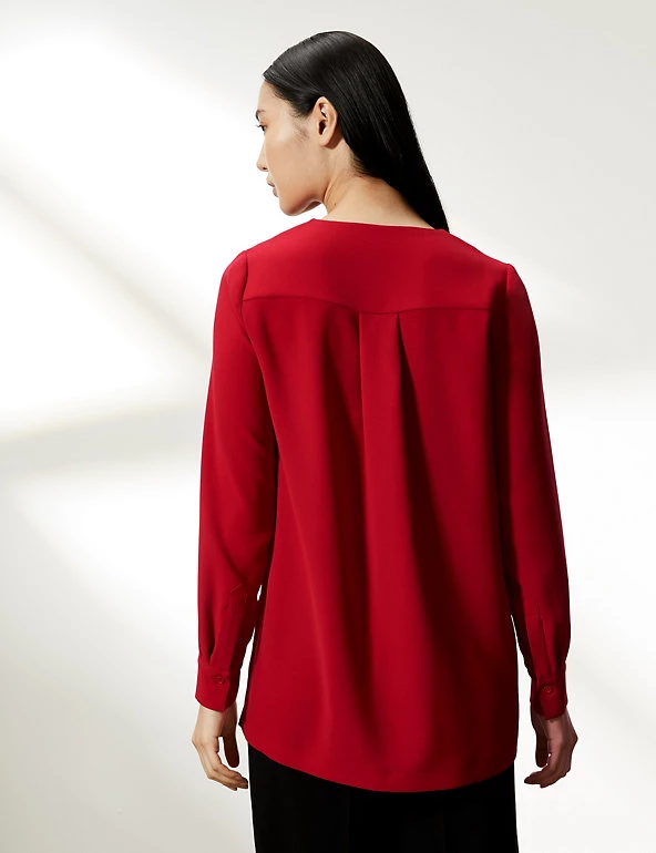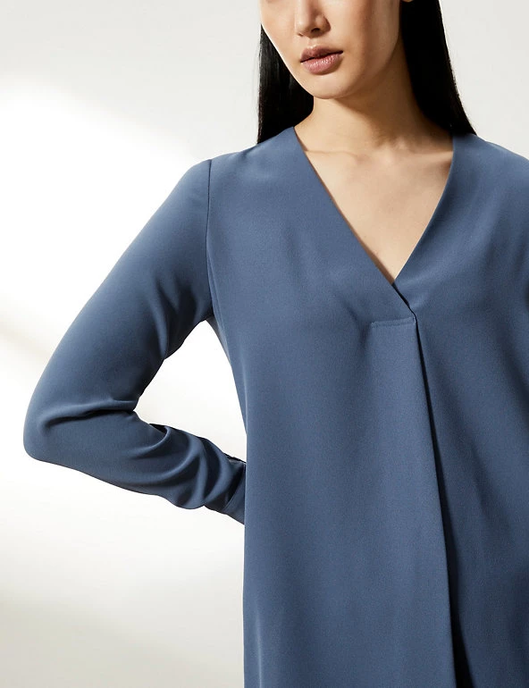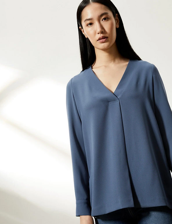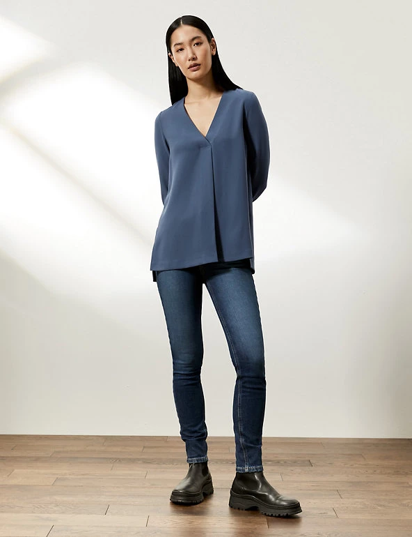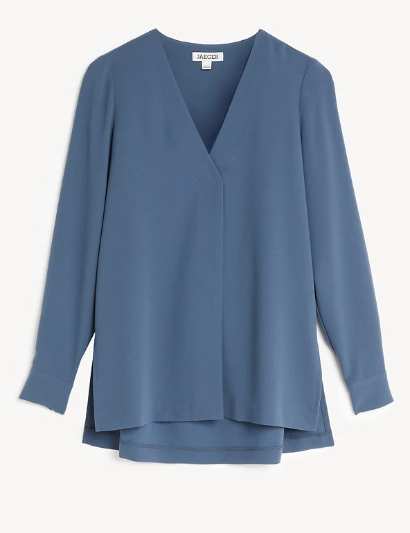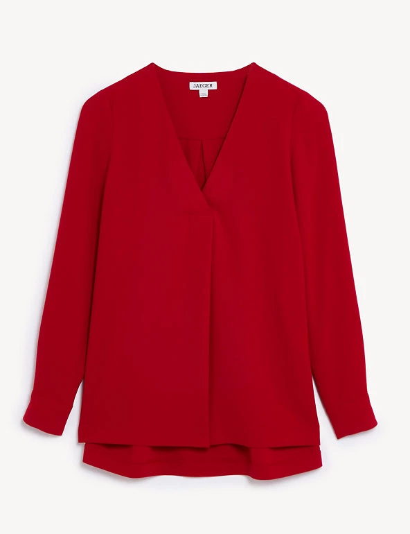 Opt for effortless elegance with this minimalist, easy-to-wear blouse from Jaeger. It has a regular fit, with a flattering v-neckline and long sleeves. A centre-front pleat adds a beautifully simple finish. Style it with tailored trousers for a softer take on office wear, or with jeans for an elevated weekend look.