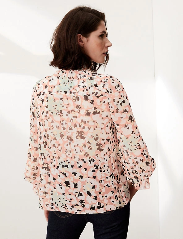 This stunning Jaeger blouse will take you seamlessly from day-to-night dressing. It’s cut to an effortless regular fit from lightweight georgette fabric for an ultra-feminine look. The long sleeves have elasticated cuffs for extra shaping, and the high neck is complemented with tie and pintuck detailing. A ruffle placket and mother of pearl style buttons add the final delicate touches to this stylish piece. Team this versatile blouse with jeans or tailored trousers to channel casual chic. Made with recycled polyester.