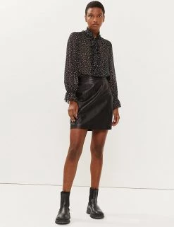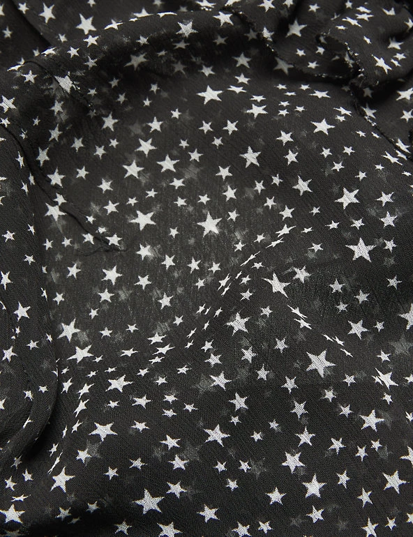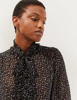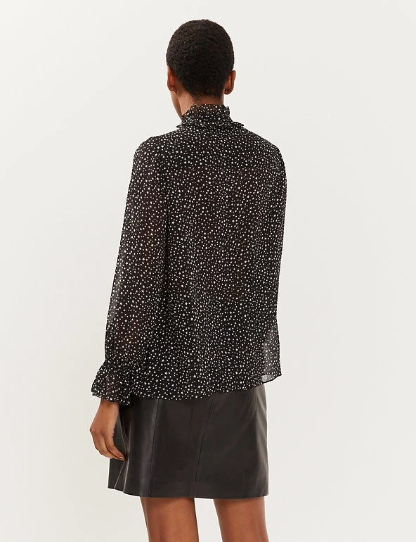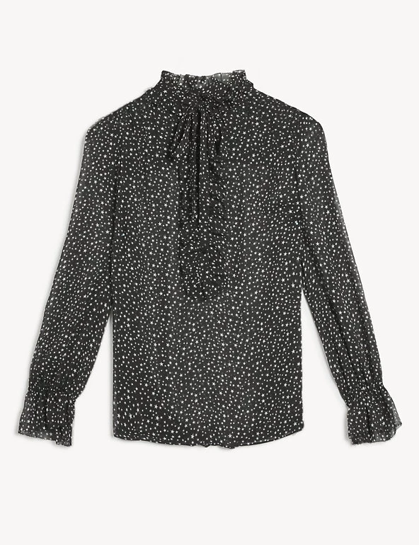 Create a modern, romantic look with this star print blouse from Jaeger. It’s cut in a relaxed fit with a high neck and tie detail. The blouse features a button-through fastening with front frill detailing and long sleeves with matching frill cuffs. Made with recycled polyester.