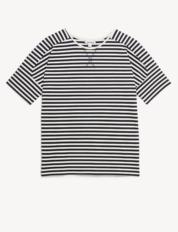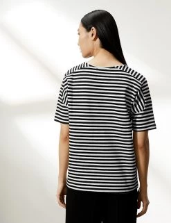 With its crisp Breton stripes, this cotton-rich top from Jaeger is made for sun-soaked days. Cut to a regular fit from supersoft fabric with added stretch, it’s designed with a flattering shape and short sleeves. A raw edge around the simple crew neckline gives it an easygoing, casual vibe. The sleeves feature bold directional stripes for a playful finishing detail. Wear it tucked into a high-waisted skirt for elevated work dressing, or pair it with jeans for a traditional nautical feel.