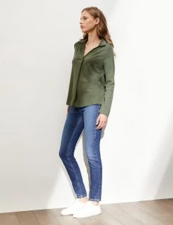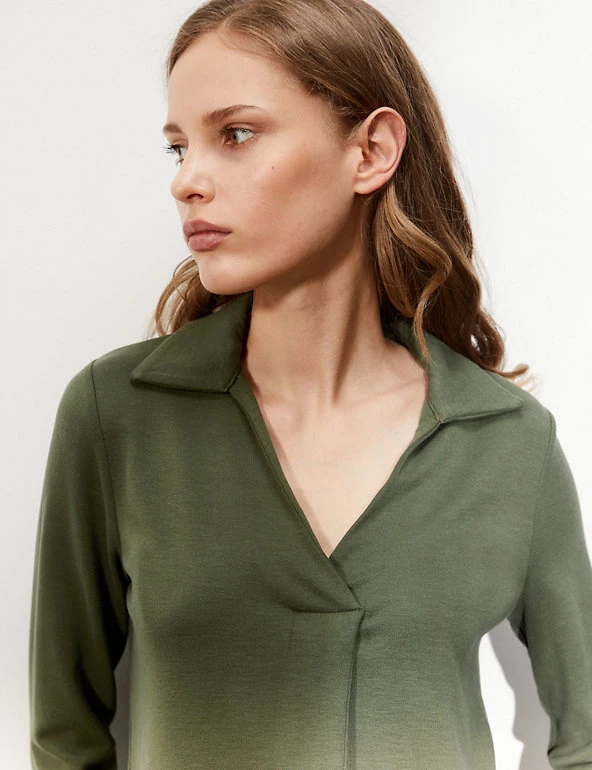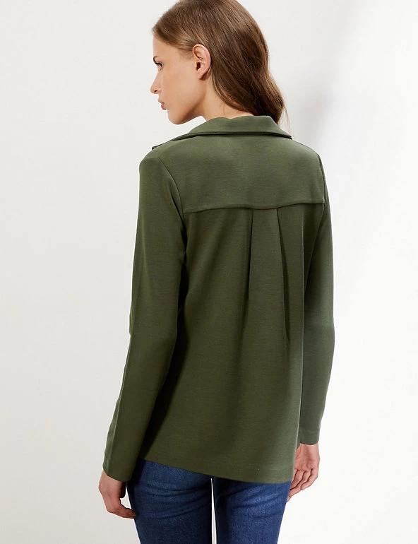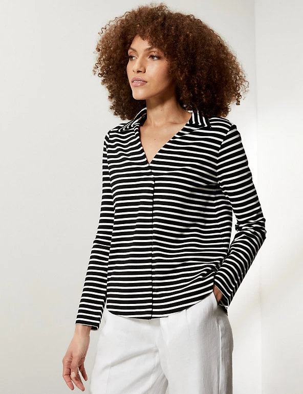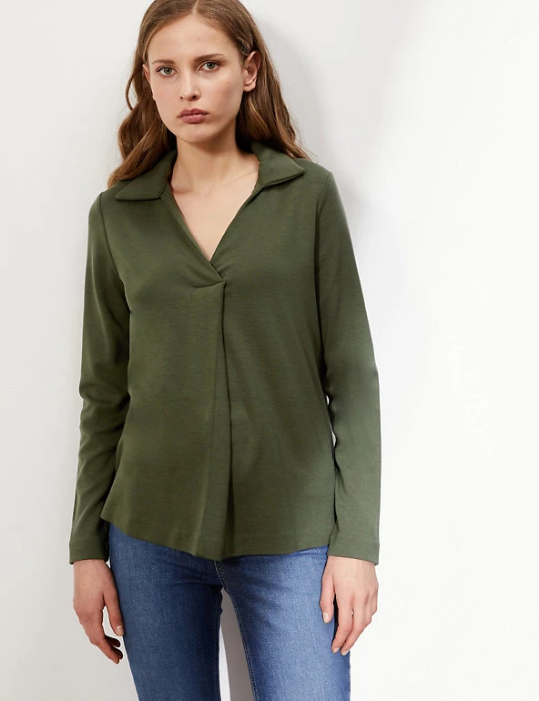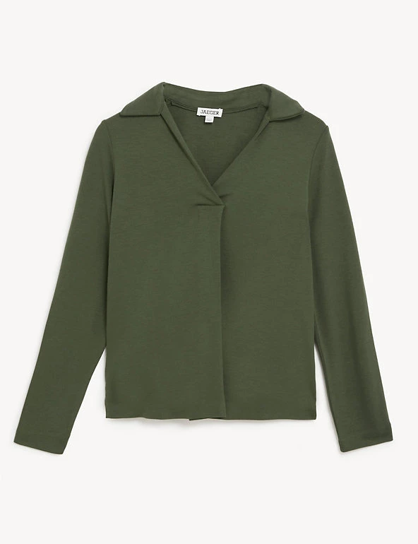 This staple top from Jaeger is a versatile classic. Crafted from a soft yet strong ponte fabric, this regular-fit style is as comfortable as it is flattering. It’s designed with added stretch for your perfect fit and features a collared v-neck and long sleeves. Just add jeans and trainers for an instant smart-casual look.