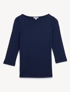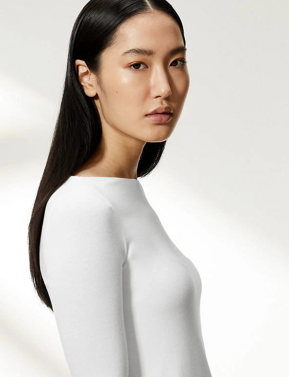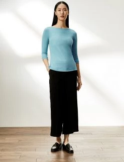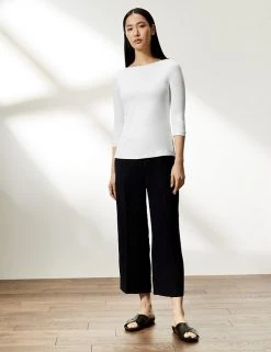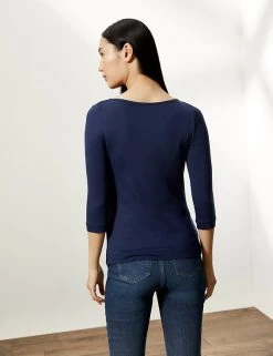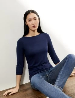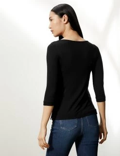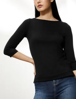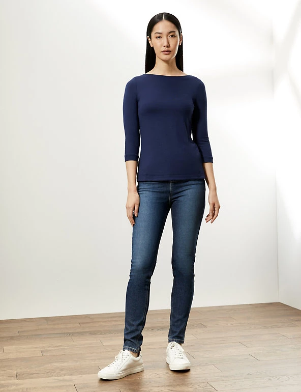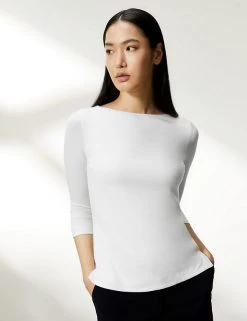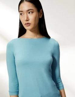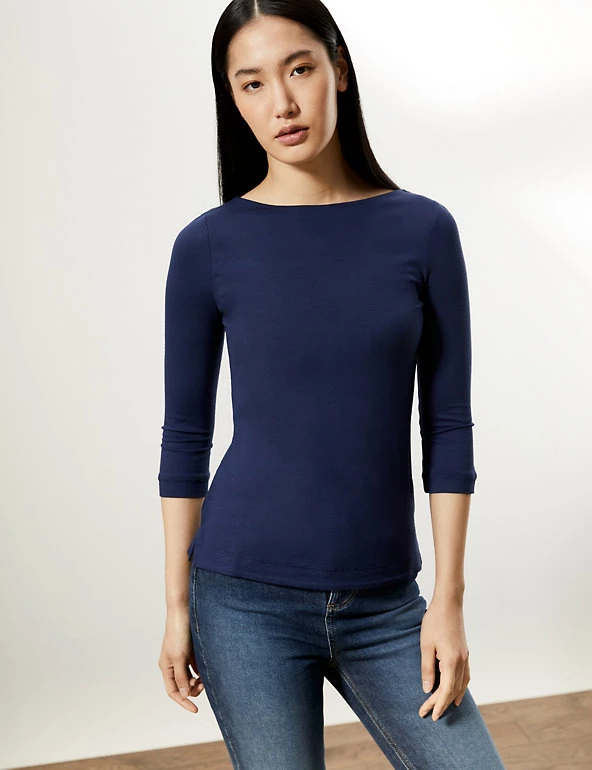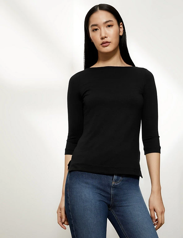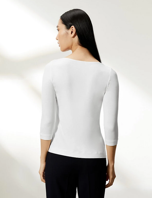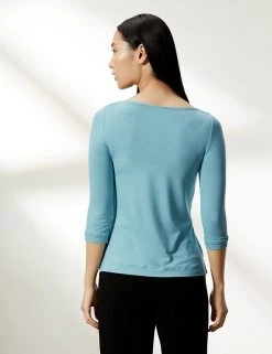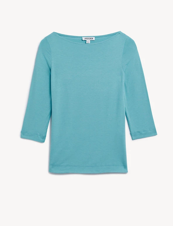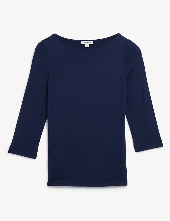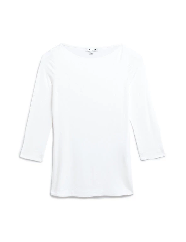 Elevate your wardrobe with this stylishly pared-back top from Jaeger. Cut in a regular fit, it has a sophisticated slash neckline and cosy three-quarter-length sleeves. The gorgeously soft, double-fronted jersey fabric comes with added stretch to provide optimal comfort. Style yours with tailored trousers for the working week, or jeans for effortless off-duty looks.