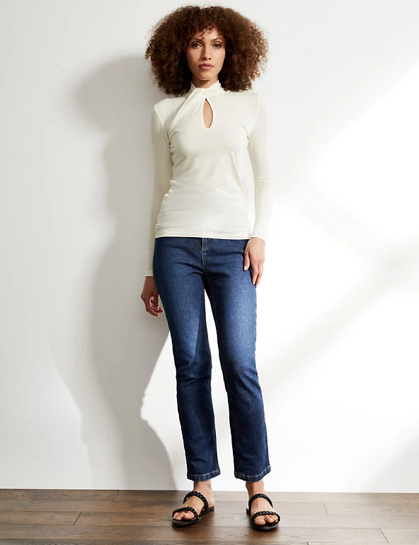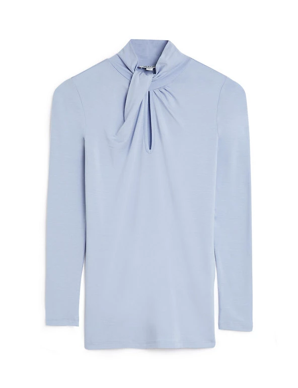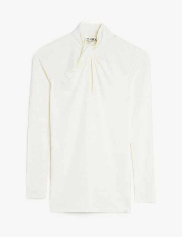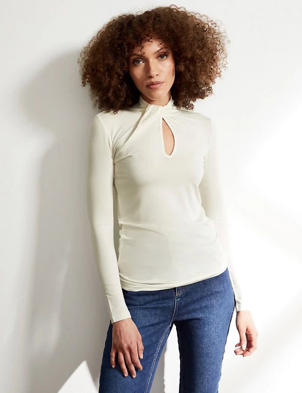 This Tencel™ rich top from Jaeger is a stylishly simple day-to-night piece. It’s crafted in an effortless regular fit, from luxuriously soft and breathable Tencel™ fabric with added stretch. The long sleeves are designed to flatter, and the elegant twist neck has modern cut-out detailing. Wear with wide-leg trousers for a modern workwear look. Made with sustainably sourced Tencel™ lyocell.