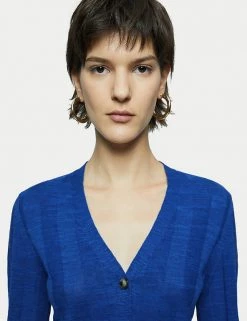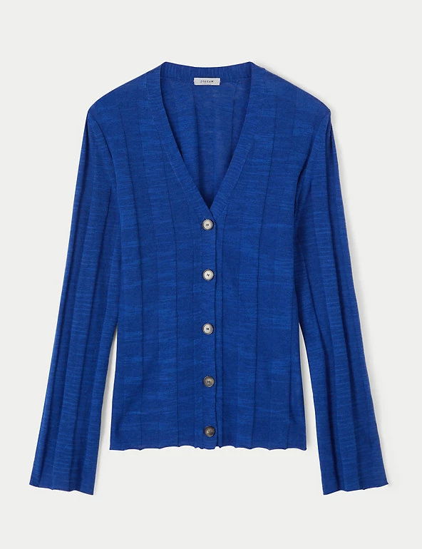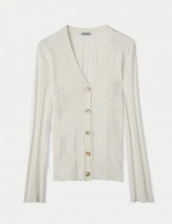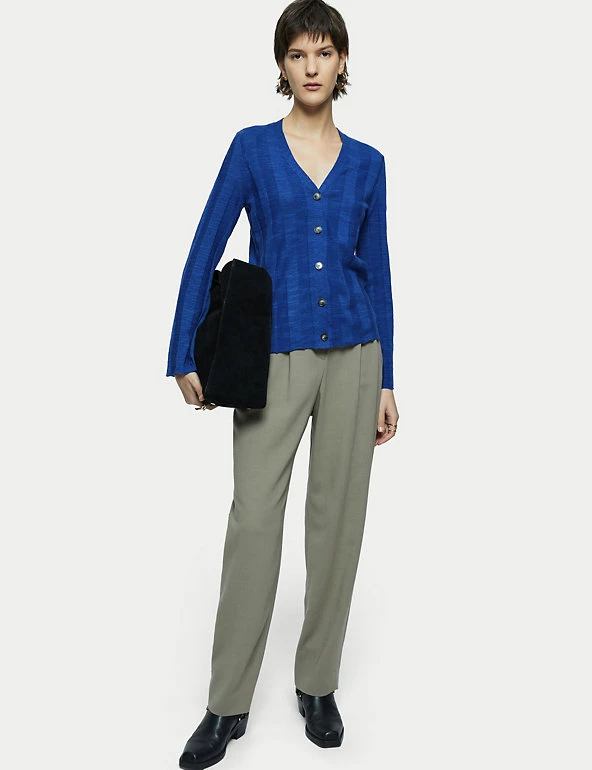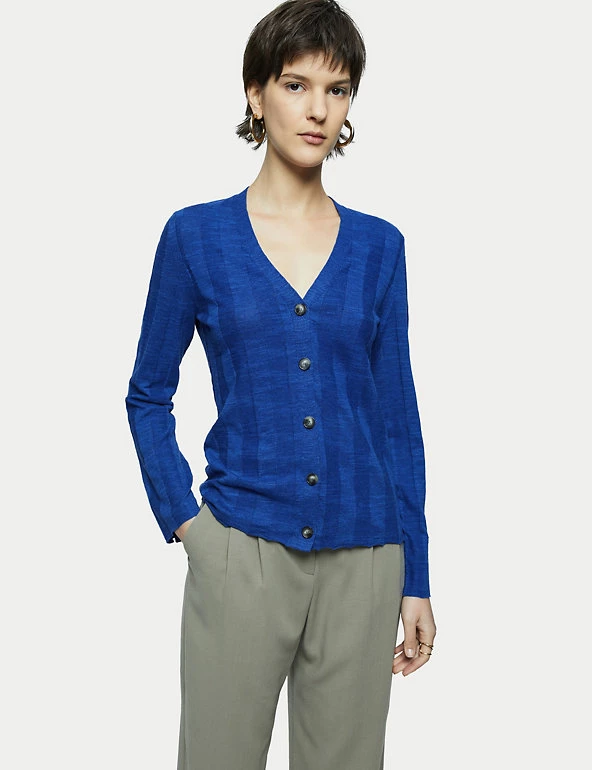 With its ombré yarn and bold textural stripes, this linen-rich cardigan from Jigsaw ensures a striking look. Its slim fit shape hugs close to your body, and the v-neckline gives it a feminine air. Contrast button fastenings add a neat finishing detail.