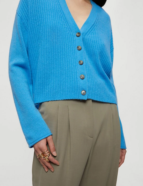 Set to become a cold-weather staple, this Jigsaw cardigan is woven from a wool-rich and cashmere blend. The relaxed fit and contemporary dropped shoulders make it ideal for layering. Stylish ribbed front panels contrast with the plain knit sleeves and back. It’s framed with a deep v-neckline and tortoiseshell buttons.
