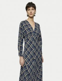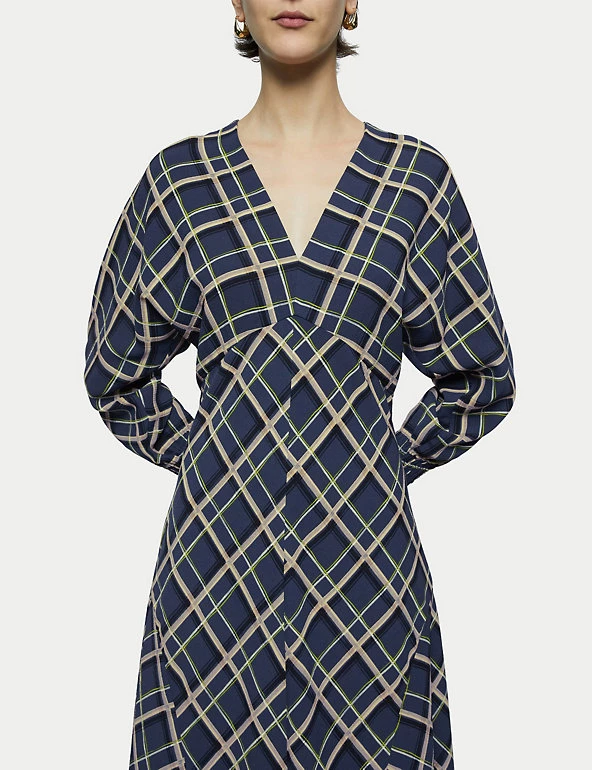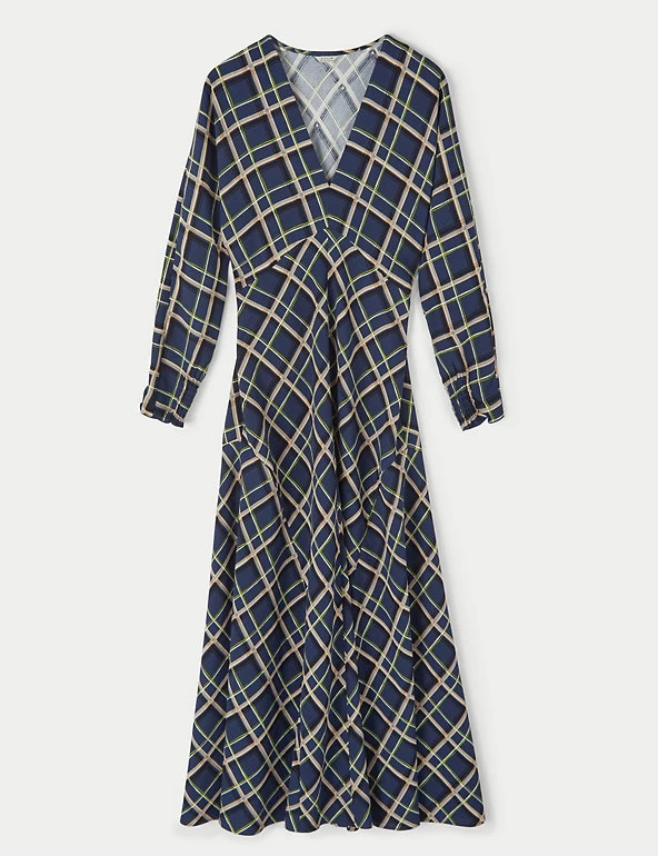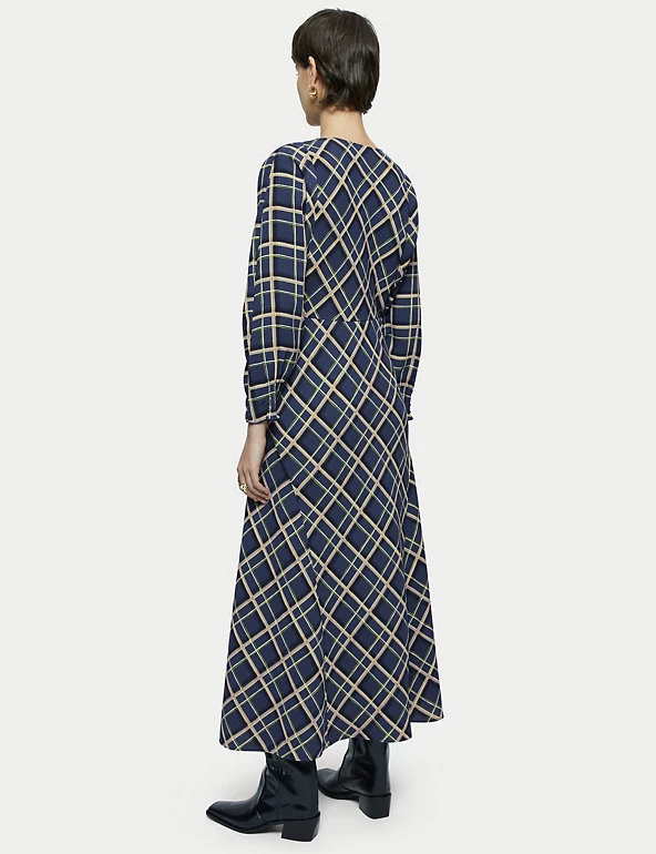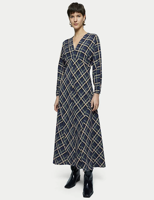 This sophisticated tea dress from Jigsaw is cut along the bias to create a beautiful drape through the body. It’s designed in a fitted shape, with a flattering v-neckline and double godet inserts to highlight your silhouette. This piece has long sleeves and falls to an on-trend midaxi length. It’s finished with a chic check print on textured weave and fastens with a zip.