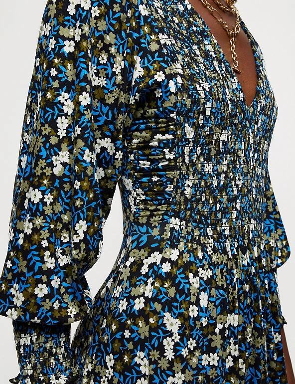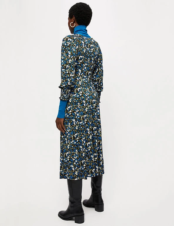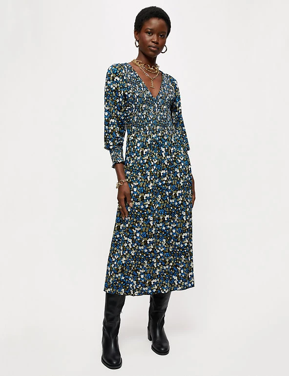 A floral ditsy print brings feminine charm to this pretty smock dress by Jigsaw. This statement midi-length piece is made in a regular fit and features a flattering v-neck. Three-quarter sleeves give this elegant occasion favourite a contemporary update, together with smocked cuffs that can be pushed up to create volume. Smocking through the bodice gives a slim fit, while the skirt has gentle flaring for a graceful finishing touch.