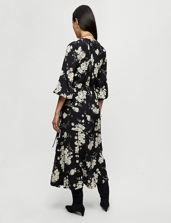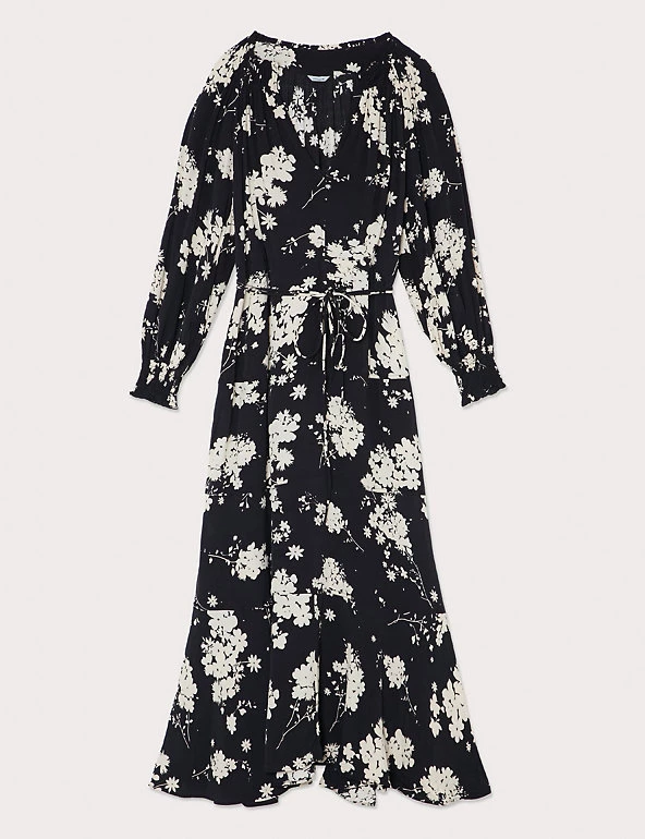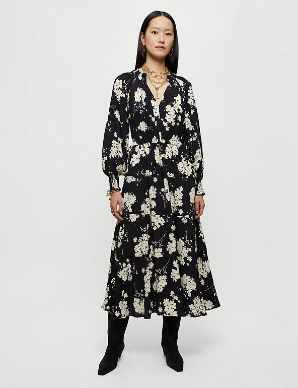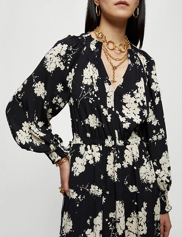 This floral print tea dress by Jigsaw will take you effortlessly from day to evening. The midaxi style is cut to a comfortable regular fit with a cinch tie at the waist for a more fitted look. Maximum floatiness comes from its tiered skirt and smocked cuff sleeves, with an alluring v-neckline making it ultra-flattering.