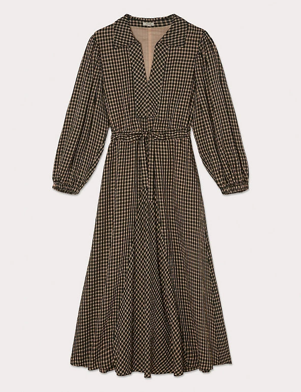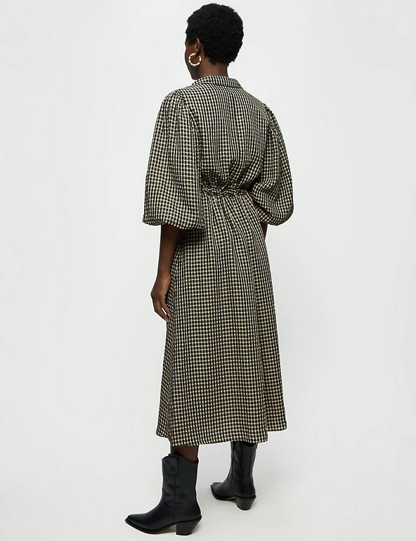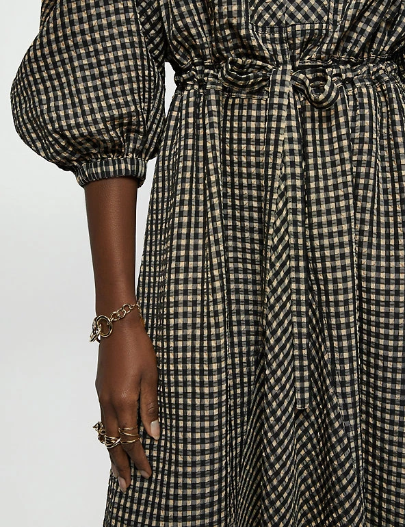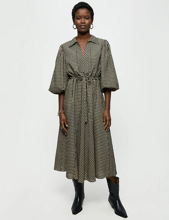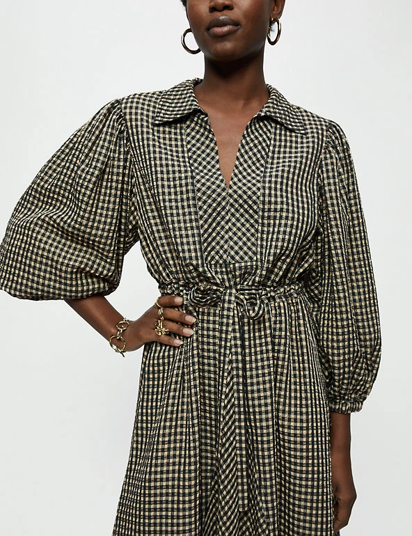Cut from textured seersucker fabric, this gingham dress from Jigsaw is a modern take on a classic. Cut in a regular fit, this shirt style features voluminous 3/4 length sleeves and a flowing midaxi skirt, balanced by a waist-enhancing tie. A wide v-neckline and collar brings a relaxed feel, making this a versatile piece that’ll take you from day to night with ease.
