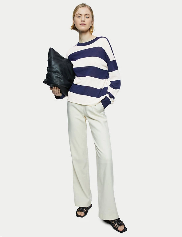 Channel a pared-back look on casual days with this cotton-rich jumper by Jigsaw. Designed in a contemporary oversized fit, this striking piece sports an all-over stripe print. The fine-gauge knit is crafted with a touch of linen for a lightweight feel. It has a classic crew neck, long sleeves and ribbed detail on the neckline and cuffs.