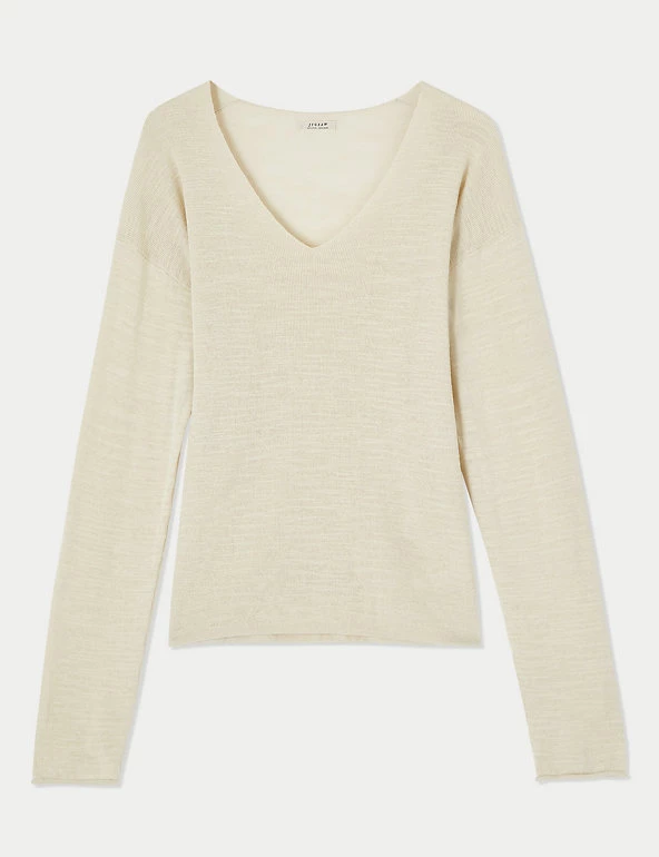 This Jigsaw jumper is made from a linen-rich yarn for a luxurious look and a gentle handfeel. Its relaxed fit creates an unstructured silhouette, while the v-neckline gives a feminine feel. The long sleeves are slightly dropped to enhance the slouchy outline.