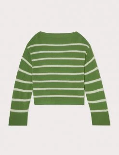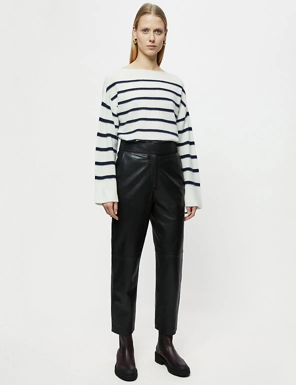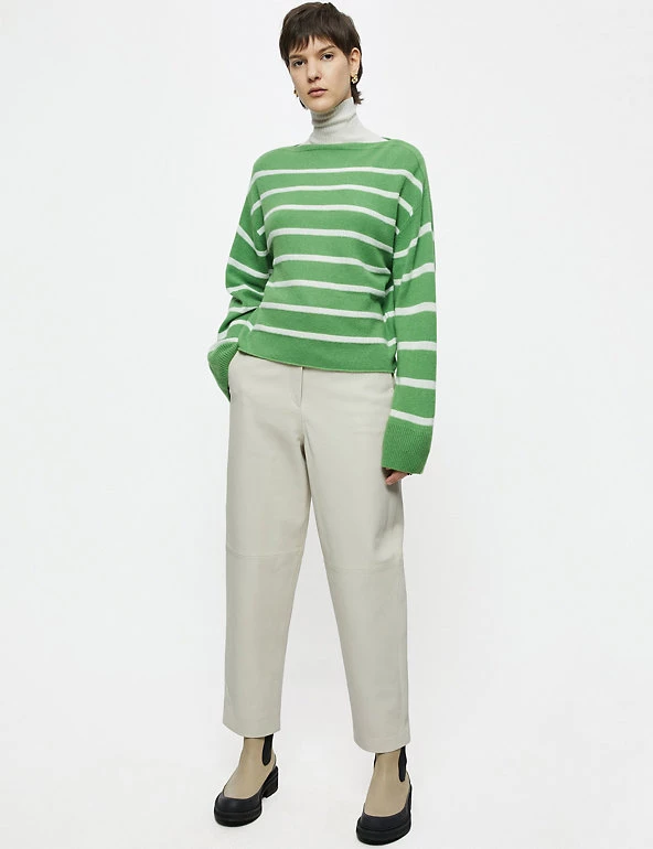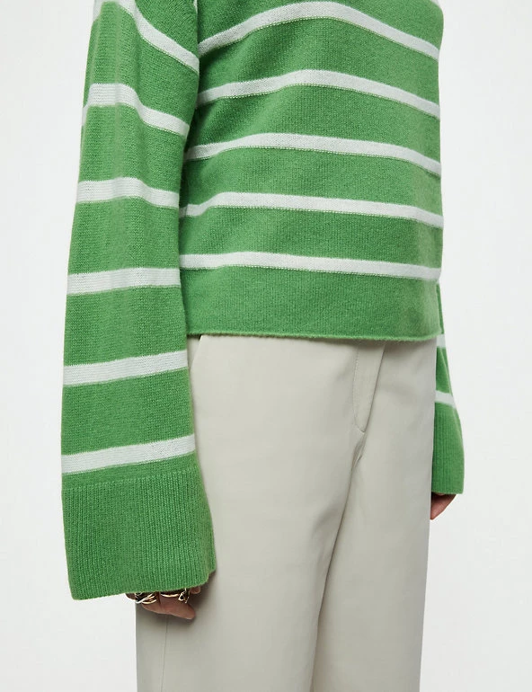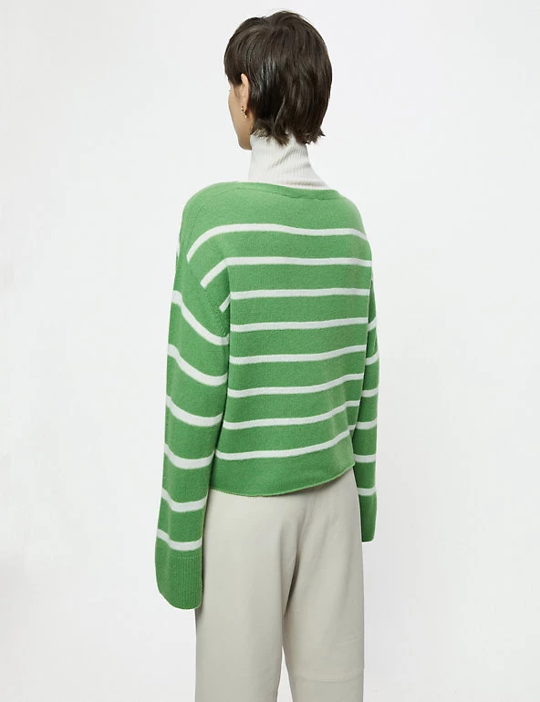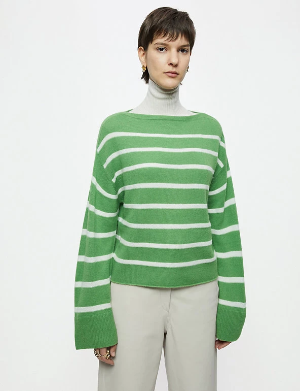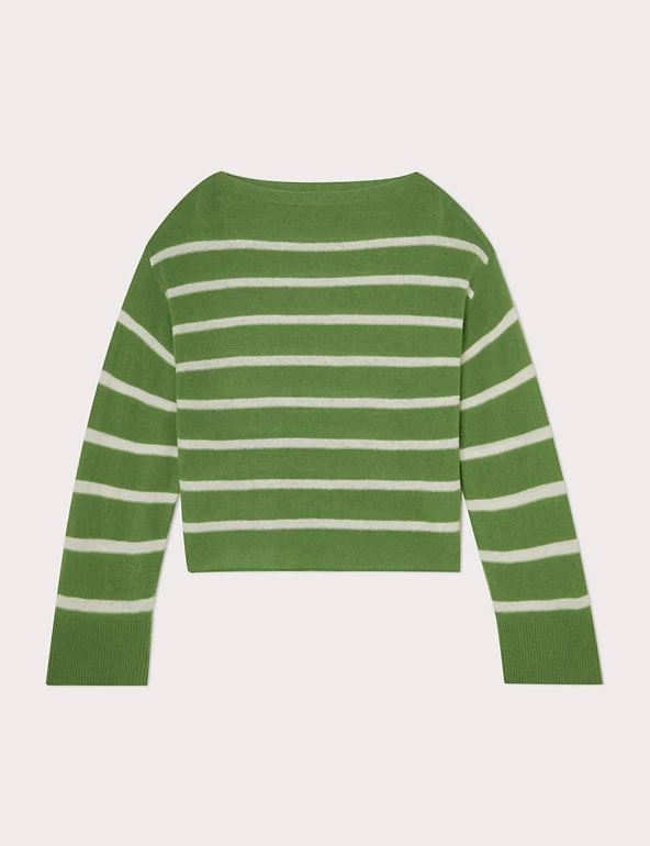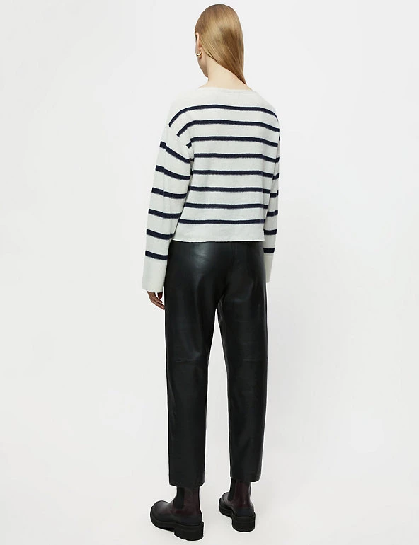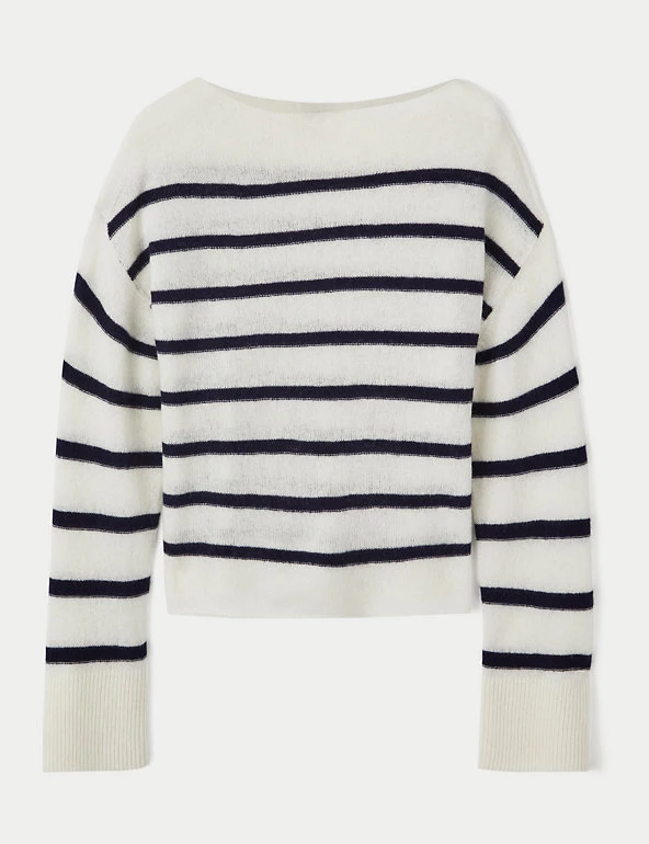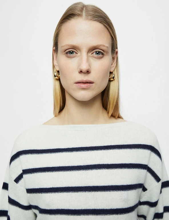 This classic Jigsaw jumper is crafted from a wool-rich fabric with cashmere for a luxurious feel. The cropped design is cut to a flattering relaxed fit, complete with a sophisticated slash neck. Long wide sleeves bring subtle volume, while dropped shoulders enhance the laid-back look. The jumper is complete with ribbed trims and has classic Breton stripes for a fresh feel.