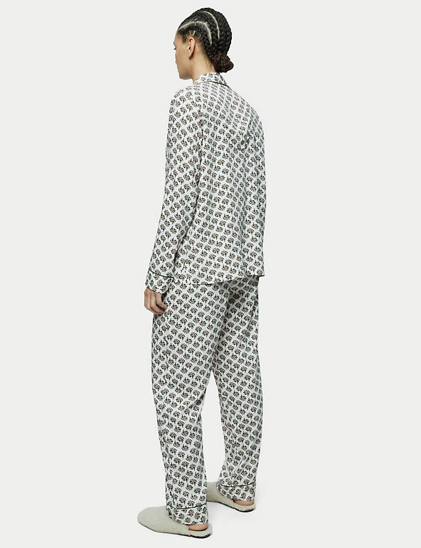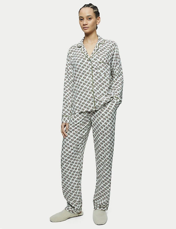 Enjoy ultimate softness with these pure-modal pyjamas by Jigsaw. The open-collar shirt and long bottoms are cut in the brand’s bestselling relaxed fit. Contrast piping and embossed mother-of-pearl buttons lend a premium touch.