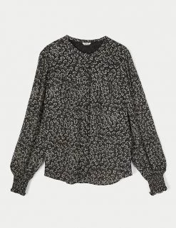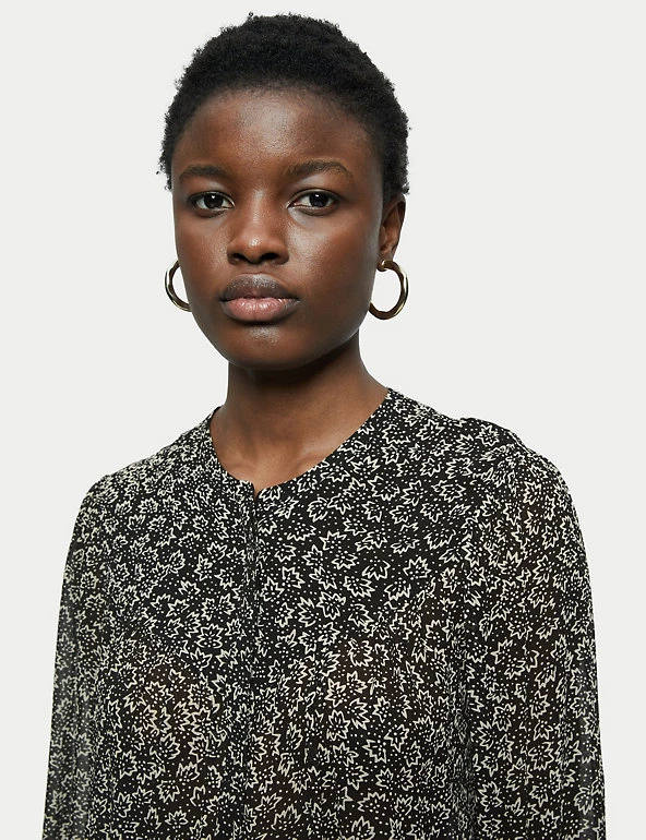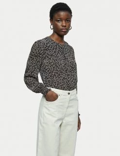 This printed Jigsaw blouse will fit seamlessly into both work and weekend wardrobes. Its relaxed fit is refined by a round neck and covered button placket. Shirred cuffs on the long sleeves enhance their blouson shape, and the curved hem looks great worn loose or tucked in. The lightweight fabric has a subtle crinkle finish, and is enhanced with multi-stitch detailing.