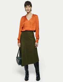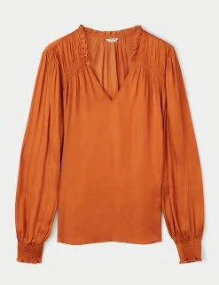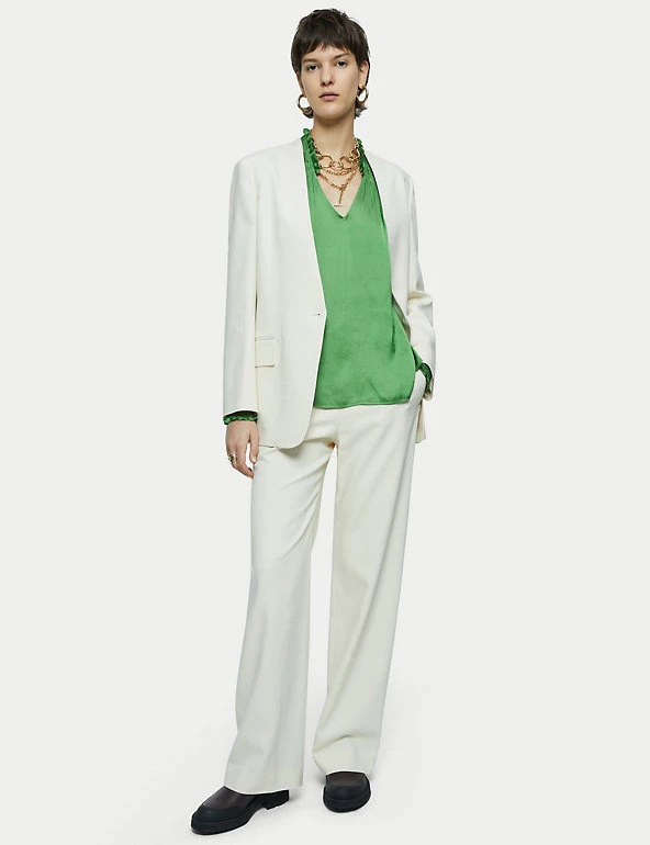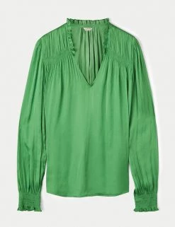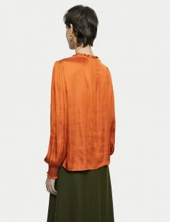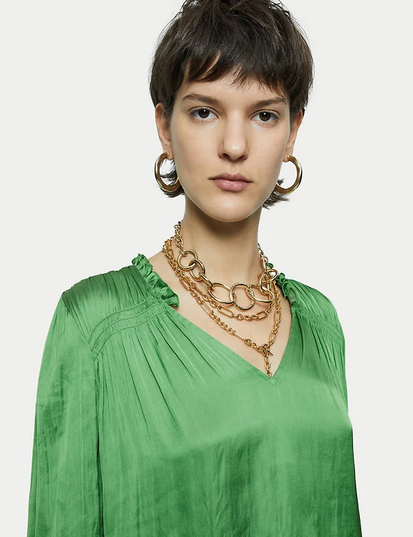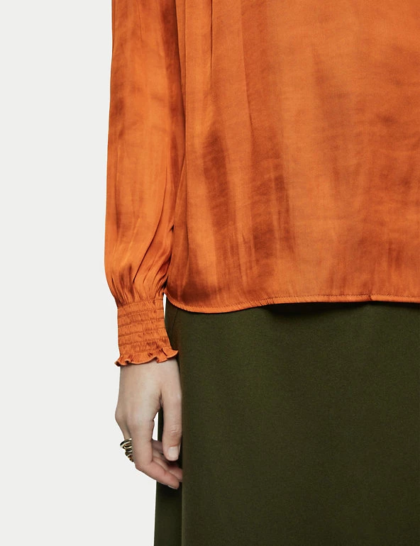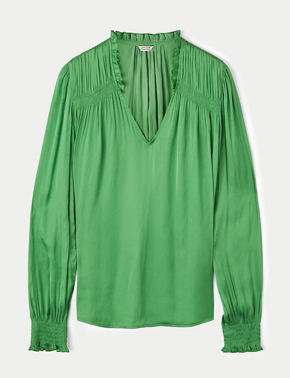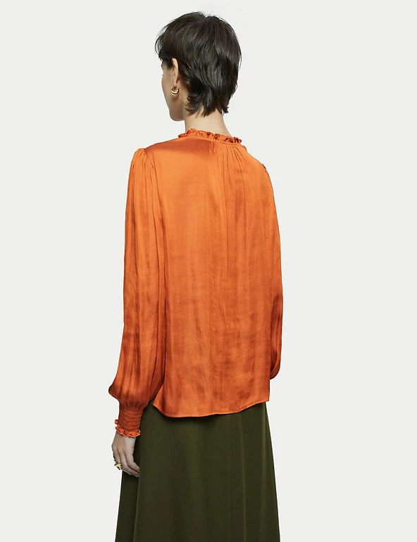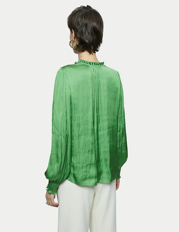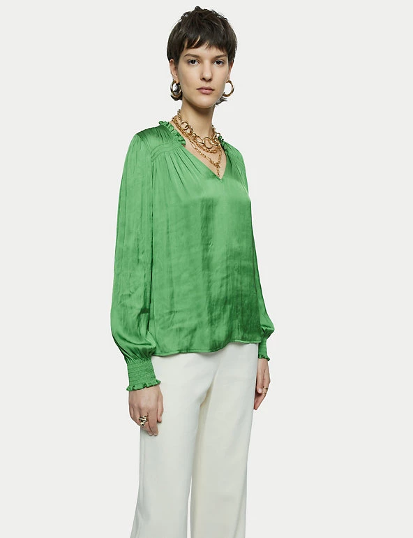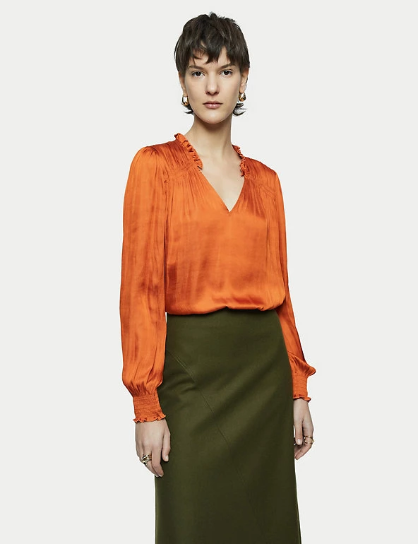 Crafted from satin for a fluid drape, this Jigsaw blouse is a must-have for day-to-night dressing. It’s cut in a regular fit, with a feminine v-neckline and elasticated, long sleeves. Smocking detail on the shoulders, together with gathering on the sleeves and neckline, add to the flattering silhouette. It’s adorned with ruffles on the sleeves and at the back of the neck, for a final flourish. Made with recycled polyester.