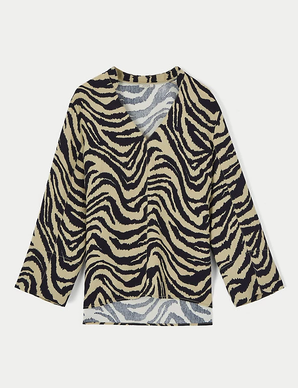 This elegant tunic top by Jigsaw embraces timeless style with its striking all-over zebra print. Designed in a comfortable relaxed fit, the smart-casual piece sports a flattering v-neck, long sleeves and side splits for ease of movement. Deep cuffs and a straight hem give it a contemporary spin. Made with recycled polyester.