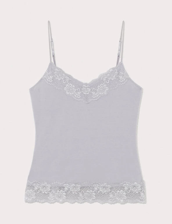 This figure-enhancing cami by Jigsaw is crafted from luxuriously soft modal-rich fabric. Coming in a regular fit, it has a flattering V-neck cut and delicate lace trim. Wear this beautiful sleeveless top solo or use it as a layering piece. The slim straps are easy to adjust for a comfortable and secure feel. Added stretch helps this everyday essential mould to your natural silhouette.