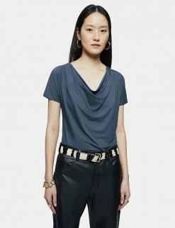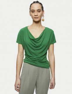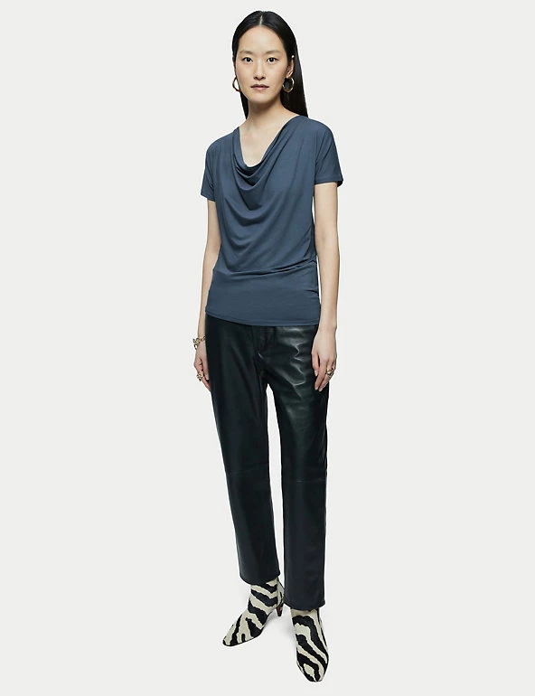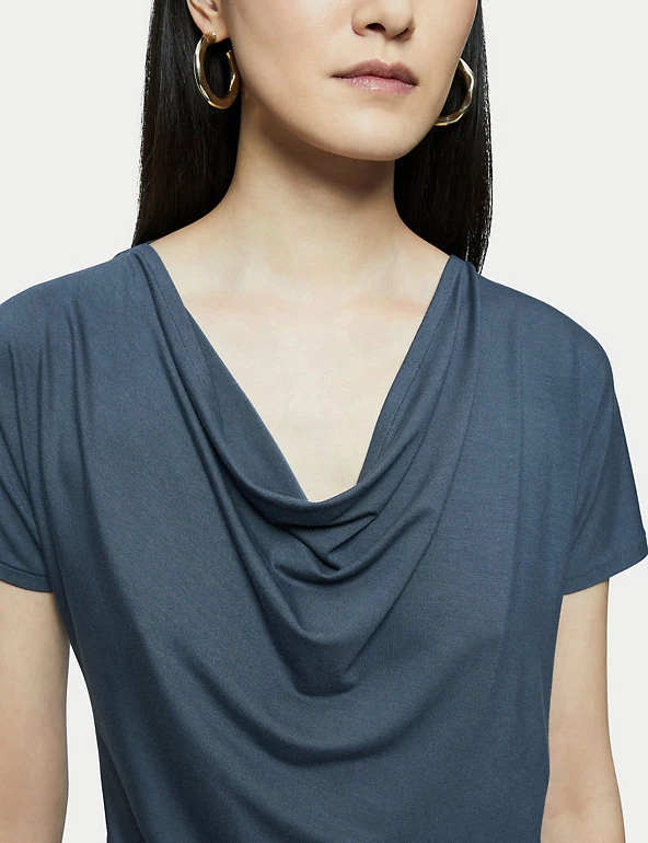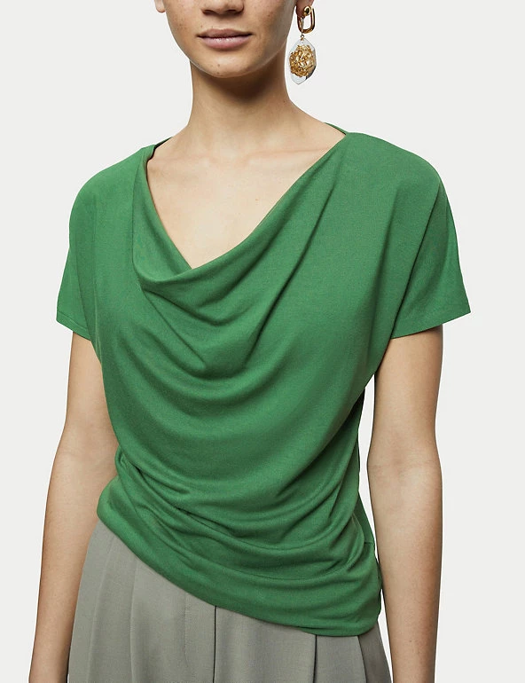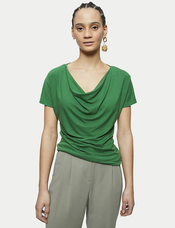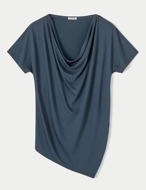 This soft and stretchy cowl-neck top from Jigsaw will bring a sophisticated edge to outfits. It’s designed in a figure-flattering slim fit with neat short sleeves. This premium style features a slanted hem, which creates natural ruching at one side for a feminine touch.