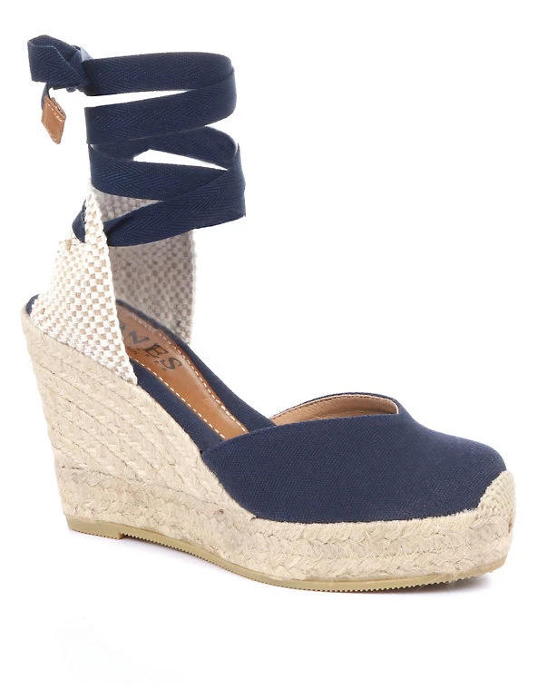 Take warm-weather looks to new heights with these espadrille sandals by Jones Bootmaker. They come in a regular fit, with a sturdy high wedge heel made of rope. A slingback heel and ties provide a secure feel around the ankle. They’re made from canvas fabric.