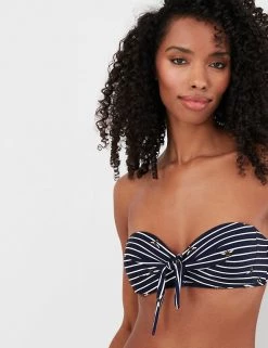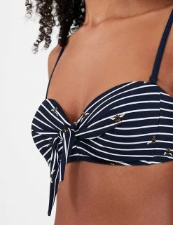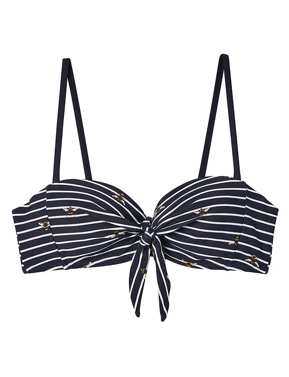 This bikini top by Joules is a must-pack for your summer holiday. Designed with added stretch for your perfect fit, it has a flattering tie front and removable straps that allow it to transform into a bandeau. The classic striped background is detailed with bees for a playful finish. Made with recycled polyester.