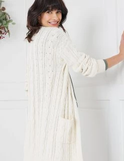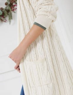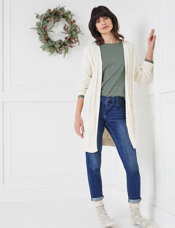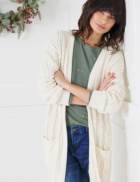 Cosy up in this pure cotton Joules cardigan for effortless cold-weather style. It’s cut to a regular fit, with an open front and long sleeves. Two patch pockets are ideal for those round-the-house essentials. The cable knit design adds a snug finish.